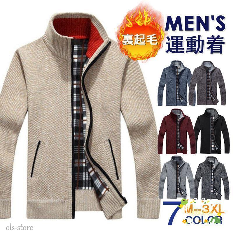 ゴルフウエア ゴルフジャケット カーディガン メンズ ニットセーター 春 立ち襟 厚手 裹起毛 ボア チェック柄 ニット アウター セーター 春 体型カバー