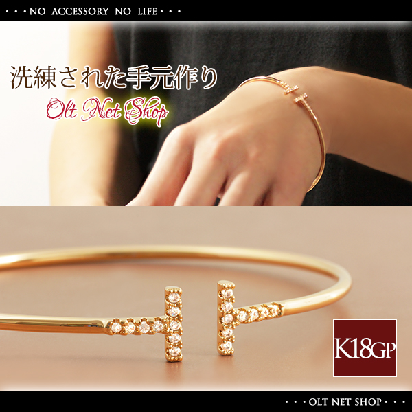 バングル ブレスレット レディース 18金 18kコーティング ピンクゴールド czダイヤ T字 デザイン