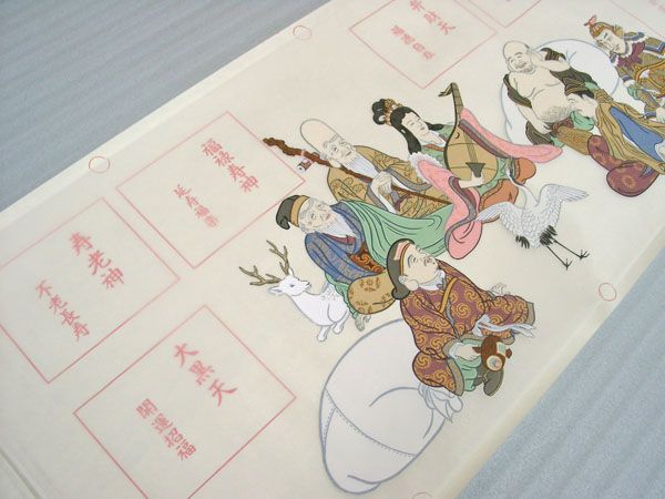 | 品番H-6 七福神 納経軸 | | 商品説明 | 七福霊場用の欄間額納経軸です。 大黒天・ゑびす神・毘沙門天・弁財天・福禄寿神・寿老神・布袋尊の七福神を巡る事ができます。 明るい色調で描かれた七福神が特徴です。 欄間額用 七福神納経軸です。お手軽価格で人気の額用軸です。 主な七福神霊場 ・淡路島七福神めぐり 淡路島にある七福神霊場です。淡路島を七福神が乗る宝舟に見立てて、淡路島内にあるお寺を巡る七福神霊場です。。 ・都七福神めぐり 京都府京都市内の社寺を巡る七福神霊場です。七福神めぐりは京都が発祥の地とされていますので歴史の古い七福神霊場です。 ・大阪七福神めぐり 大阪市天王寺区の三光神社から四天王寺までを巡る七福神霊場でゆっくり歩いて徒歩で4時間ぐらいで巡拝できます。 全国には他にも多数の七福神霊場があります。 納経軸に納経を頂けるかどうかは事前に巡拝される七福神霊場に確認をお取りになる事をお勧めします。 | | 素材・材質 | 絹本 仮巻軸付・ビニール製掛軸入れ | | 納経スペース寸法 | 絵絹寸法 高さ39cm×幅95cm | | 1マス寸法 | 高さ10.5cm 幅13cm | | 納経スペース | 七ヶ所 | |