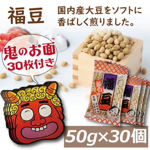 福豆50g x 30個 鬼面(30枚付き!)箱入り 節分豆 素煎り大豆