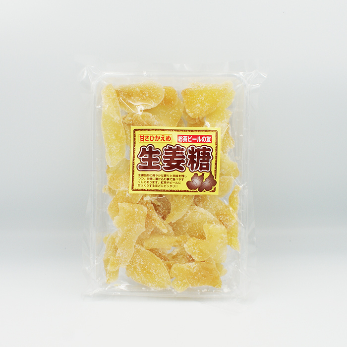甘さひかえめお茶やビールの友生姜甘納豆、生姜独特の爽やかな香りと辛味を残しつつ、砂糖に漬け込むことで食べやすくなっております。
