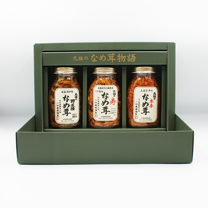 元祖の寿なめ茸に他2種類を選んで加えた贈答用の元祖のなめ茸物語3種セットです