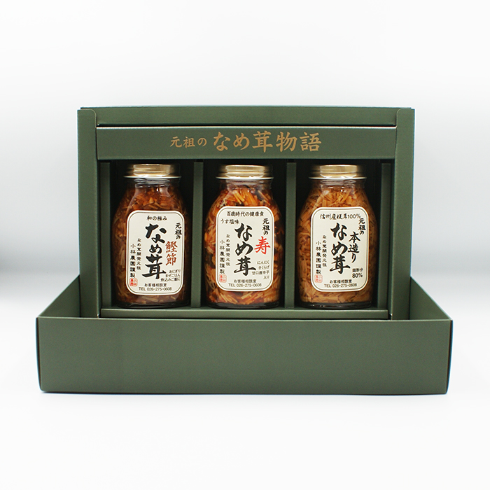 元祖の寿なめ茸に他2種類を選んで加えた贈答用の元祖のなめ茸物語3種セットです