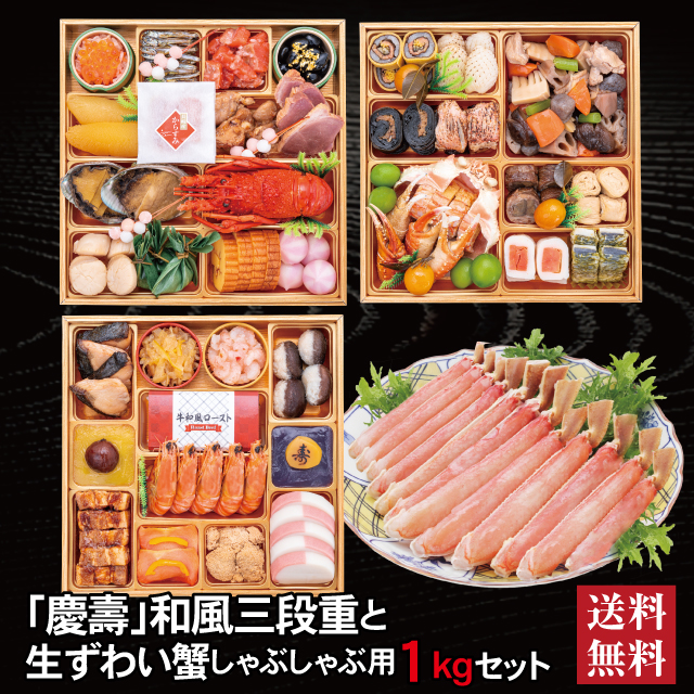 おせち 2026 生ずわい蟹 セット 「慶壽」冷蔵 8.5寸 三段重 全41品 4人前 5人前「生ずわい蟹」冷凍 しゃぶしゃぶ用1kg 送料無料 千賀屋