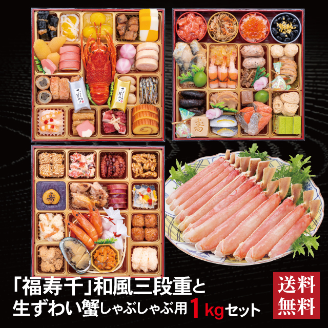おせち 2026 生ずわい蟹 セット 「福寿千」 冷蔵 8.5寸 三段重 全59品 4人前 5人前 「生ずわい蟹」 冷凍 しゃぶしゃぶ用1kg 送料無料 千賀屋