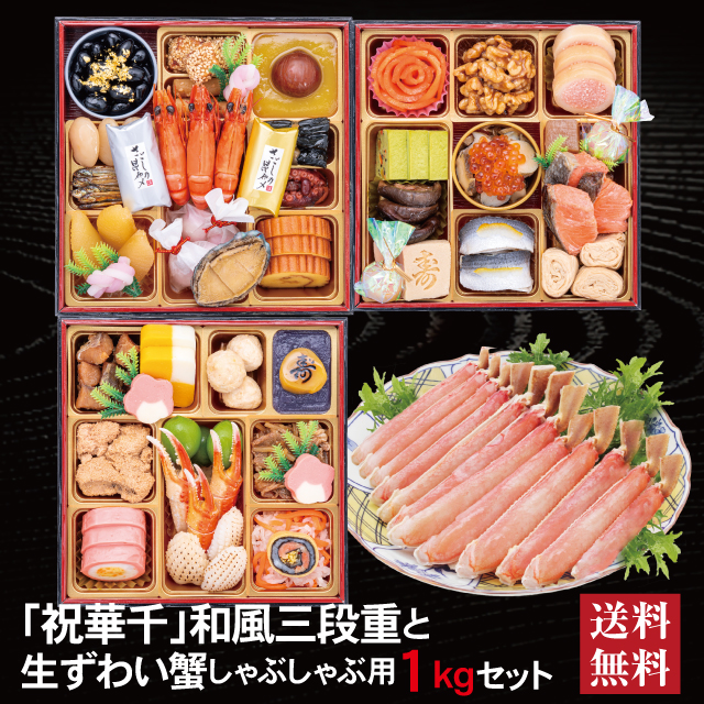 おせち 2026 生ずわい蟹 セット 「祝華千」 冷蔵 6.5寸 三段重 全41品 3人前 「生ずわい蟹」 冷凍 しゃぶしゃぶ用1kg 送料無料 千賀屋
