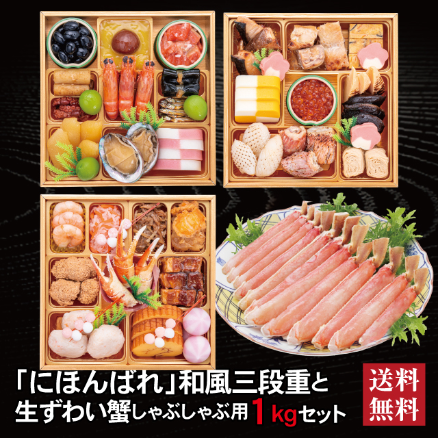 おせち 2026 生ずわい蟹 セット 「にほんばれ」 冷蔵 6.5寸 三段重 全34品 3人前 「生ずわい蟹」 冷凍 しゃぶしゃぶ用1kg 送料無料 千賀屋