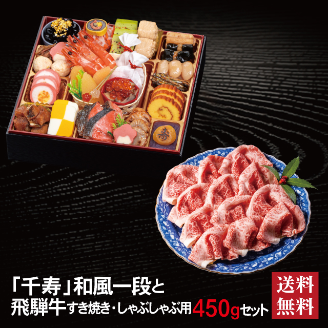 おせち 2026 飛騨牛 セット 「千寿」 冷蔵 8.5寸 一段 全25品 2〜3人前 「飛騨牛」 冷凍 すき焼き しゃぶしゃぶ用 450g 送料無料 千賀屋