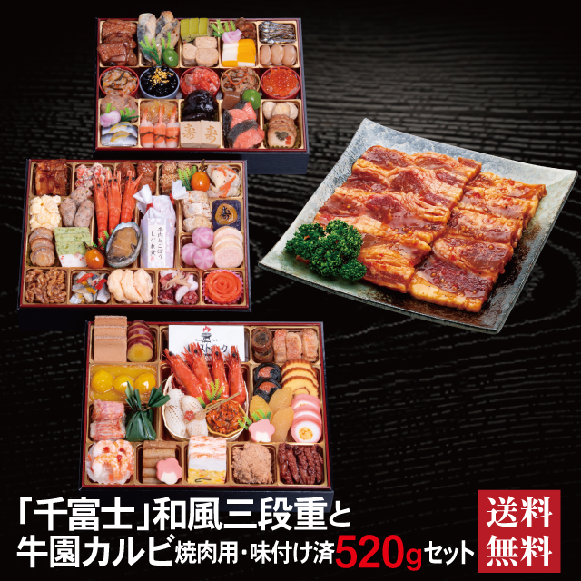 おせち 2026 牛園カルビセット「千富士」 冷蔵 10.5寸 三段重 全71品 6人前 7人前 「牛園カルビ」 焼肉用 味付け済 送料無料 千賀屋