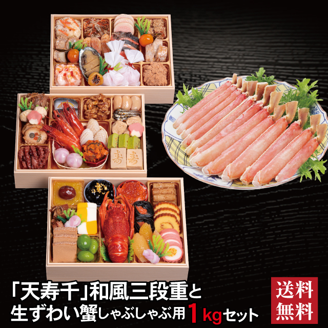 おせち 2026 生ずわい蟹 セット 「天寿千」冷蔵 長方形 三段重 全45品 4人前 5人前「生ずわい蟹」冷凍 しゃぶしゃぶ用1kg 送料無料 千賀屋