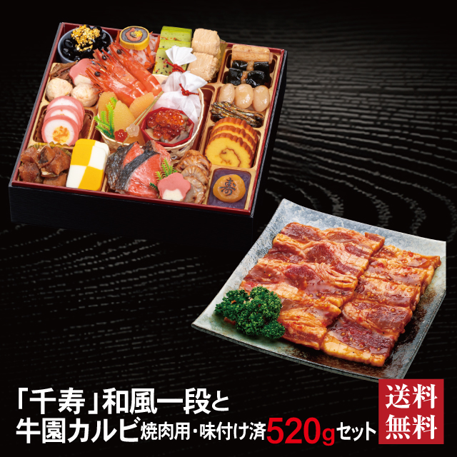 おせち 2026 牛園カルビセット「千寿」 冷蔵 8.5寸 一段 全25品 2〜3人前 「牛園カルビ」 焼肉用 味付け済 送料無料 千賀屋