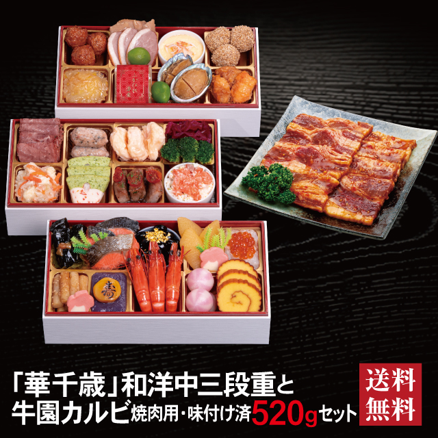 おせち 2026 牛園カルビセット「華千歳」冷蔵 長方形 和洋中 三段重 全32品 2人前 3人前 「牛園カルビ」 焼肉用 味付け済 送料無料 千賀屋