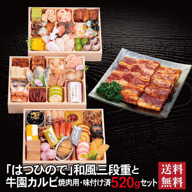 おせち 2026 牛園カルビセット 「はつひので」冷蔵 長方形 三段重 全46品 4人前 5人前「牛園カルビ」 焼肉用 味付け済 送料無料 千賀屋