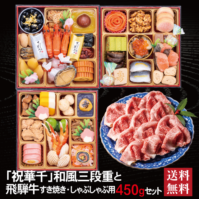 おせち 2026 飛騨牛 セット 「祝華千」 冷蔵 6.5寸 三段重 全41品 3人前 「飛騨牛」 冷凍 すき焼き しゃぶしゃぶ用 450g 送料無料 千賀屋