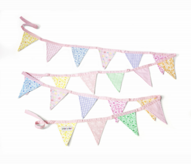 2枚地になっていて表側も裏側も生地の模様が出るので、空間を横断させたり巻き付けて使ってもきれいに見えます。3mの長さの中に、種類の違うファブリックの旗が21枚並んでおり、華やかでかわいらしい色づかいです。
