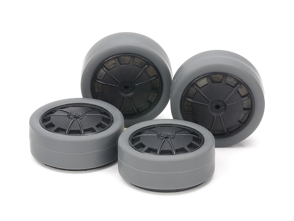 【 マシンの性能アップやセッティングに役立つパーツです 】 ディッシュデザインのカーボン強化ホイールと、スーパーハード小径ローハイトタイヤ(26mm)を4本ずつ、1台分セットしました。カーボンファイバー配合樹脂製のホイールは強度が高く、跳ねにくさも特徴。タイヤはキット標準タイプに比べて硬く、ローグリップのため、コーナリング時にスピードが落ちにくく、ジャンプの後の着地でもマシンが跳ねにくくなります。カラーはタイヤがグレイ、ホイールは精悍なブラック。小径タイヤを装着したスーパーX、スーパーXX、FM-Aシャーシ採用のミニ四駆各車に使えます。