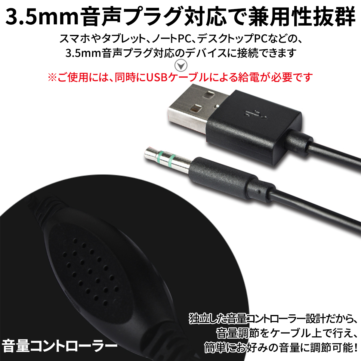 ※ご使用には、USBによる給電と3.5mm音声プラグの同時接続が必要です。