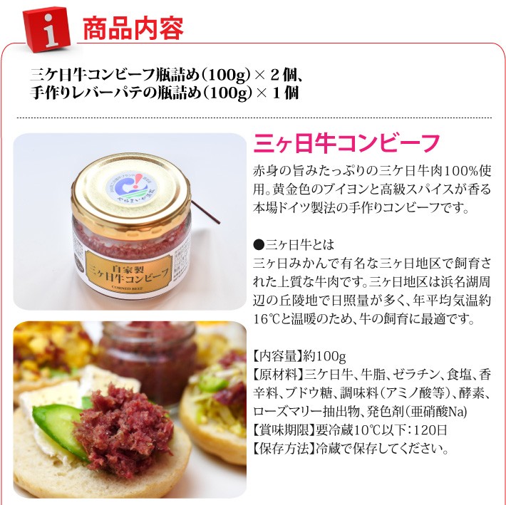 【セット内容】三ケ日牛コンビーフ瓶詰め(100g)×2個、手作りレバーパテの瓶詰め(100g)×1個