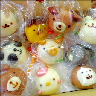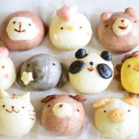 パンダ(あずき餡)、ゾウ(しろあん)、ライオン(チーズ)、クマ(チョコレート)、サル(ホワイトチョコレート)、いぬ(かぼちゃ)、ねこ(カスタード)、にわとり(ココナッツミルク)、うさぎ(さつまいも)、ぶた(肉まん)を楽しんでください。