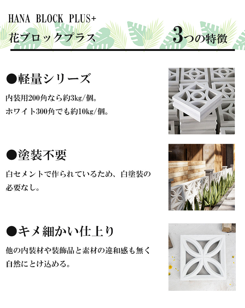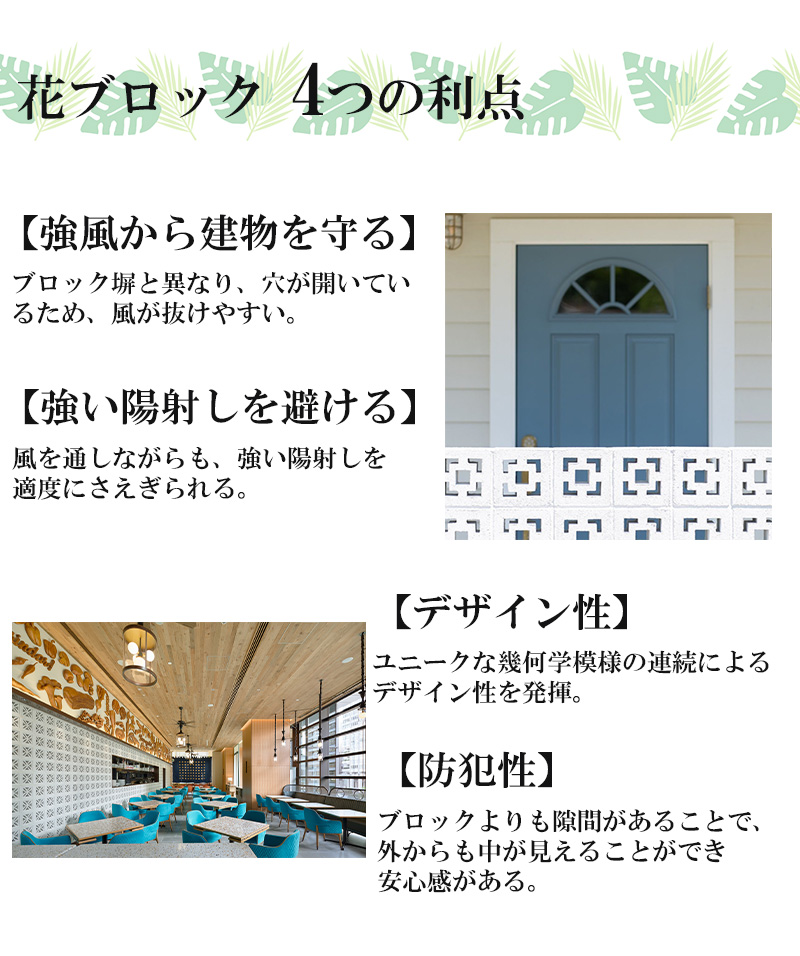 | ●軽量CP20シリーズに関して 花ブロックプラス(軽量CP20シリーズ)は内装用の装飾コンクリートブロックです。 CB100等の普通ブロック(補強コンクリートブロック)ではございません。 また花ブロックプラスは白セメントと天然の砂を混ぜて作っています。 製造上白い花ブロックのため汚れや、稀に小さなこげ茶色の斑点が数か所ほど出ることがあり、交換はできません。 気になる場合はサンドペーパーや市販のタッチアップ材でカバーしてください。 鉄筋溝は四方にありますが装飾用ブロックのため溝が小さく、幅20mm、深さ5mmとなり、10mm目地の場合、鉄筋溝空洞部は直径20mmとなり、鉄筋周囲の空洞部にモルタルが十分に充填できないため強度が出ません。 そのため花ブロックプラス(CP20シリーズ)を単体で積み上げるのは大変危険ですのでおやめ下さいますようお願いいたします。 設計者・施工業者様とご相談の上、補強コンクリートブロック・鉄筋コンクリート・金属枠他で支え、必要に応じて控え壁等を施工し倒壊による事故が起きないよう安全を確保してください。 基本的には内装用となります。そのため、外部での使用、内装であっても危険な施工その他当サイトに記載する注意事項に反する使用につきましては当社では一切の責任を負いません。 ●花ブロックプラスに関して 鉄筋は6mm〜10mmを使用し、必ず目地幅は縦・横共に10mm以上とって下さい。 またセミハンドメイド製品のため寸法差・形状差・色幅があります。 個体差により鉄筋溝にズレを生じる場合があるため、初めてお使いの方は施工前に現物をご覧になったうえで施工(配筋)計画をお願いいたします。 また高さは1m以下を推奨しています。 施工事例写真などは、輸入品の花ブロックプラスの連続した柄パターンをご覧いただくためのもので海外の施工例も掲載しています。 高さも含めて日本と海外とでは施工基準や施工方法は異なり、日本において施工例写真のような施工を行うことは非常に危険ですのでおやめください。 当社において、このような施工例を推奨しているものではありません。 花ブロックプラスは白セメントで作られており(塗装品ではありません)吸水性があります。 施工中や施工後に色付きの液体(特にコーヒーなど)が染み込むことが想定される場合には塗装やその他(撥水剤等)表面処理剤をお勧めいたします。 一度染み込むと取れません。また寒冷地では吸水し凍害にあう場合がありますのでご注意ください。 また、白セメントと天然の砂を使用しているため、製造上汚れや稀に表面に数か所のこげ茶色の斑点が出ることがありますご了承ください。 気になる場合は市販の白いタッチアップ材か粗目のサンドペーパーで研磨してください。 気温が5℃以下、または5℃以下になると予想される場合には施工不良となる場合がありますので施工は行わないでください。 花ブロックプラスは段ボール箱に入っていますが、セメント製品のため荷下ろしの際に箱を角から着地しますと角カケを起こしますのでご注意ください。 また段ボール箱の中ではビニール袋に入っていますが、湿気を逃がすためビニール袋は密閉していませんので、雨等で箱が濡れると水が染み込み、段ボール色が白い花ブロックに色移りする場合があります。箱は濡らさないようにお願いいたします。 セメント製品のため部分的に細かいカケがある場合がございますのでご了承ください。 コンクリートブロックの施工については、一般社団法人全国建築コンクリートブロック工業会においても注意喚起がされていますので、ご参照ください。 |