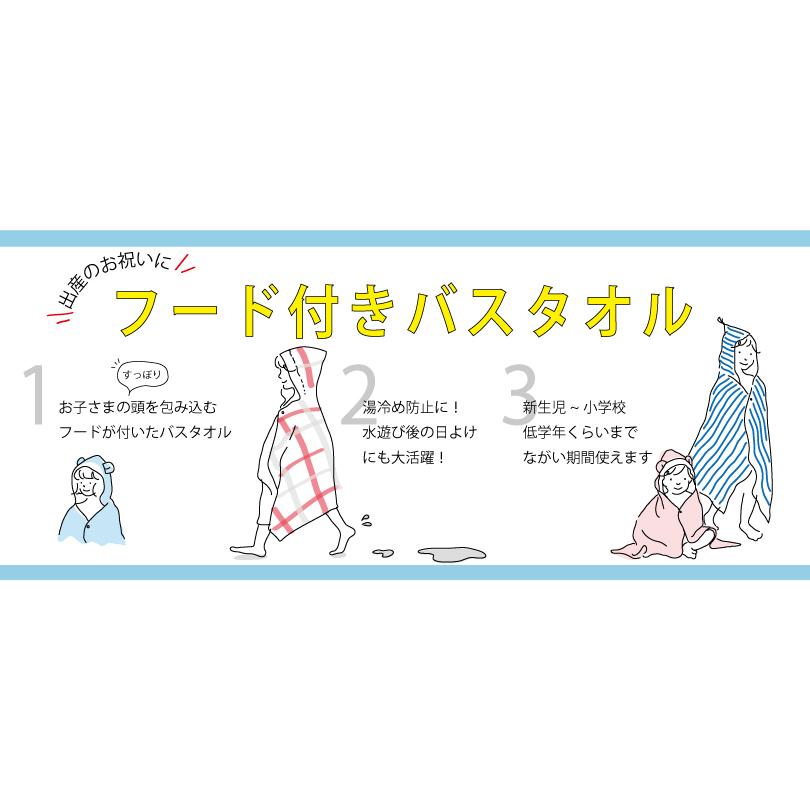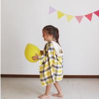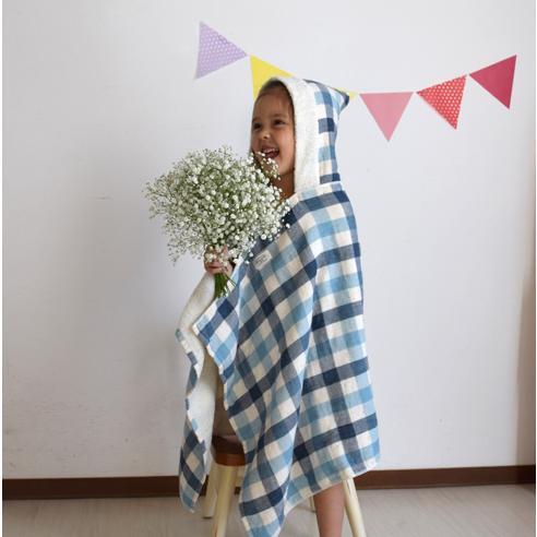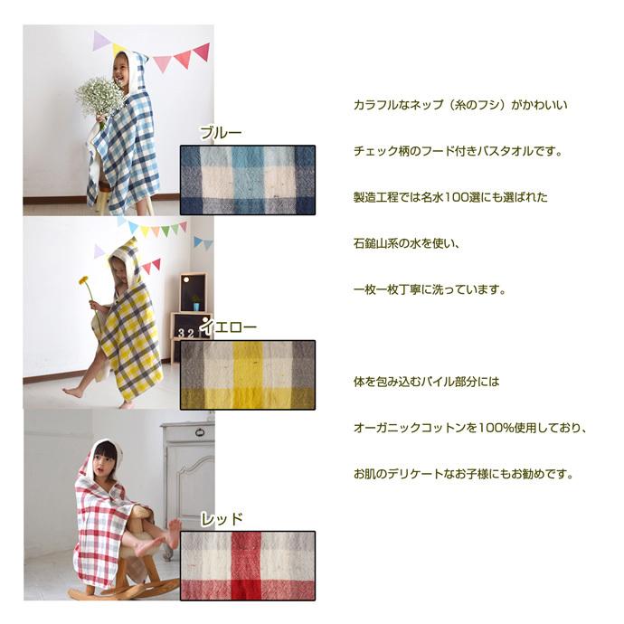 カラフルなネップ(糸のフシ)がかわいいチェック柄のフード付きバスタオルです。