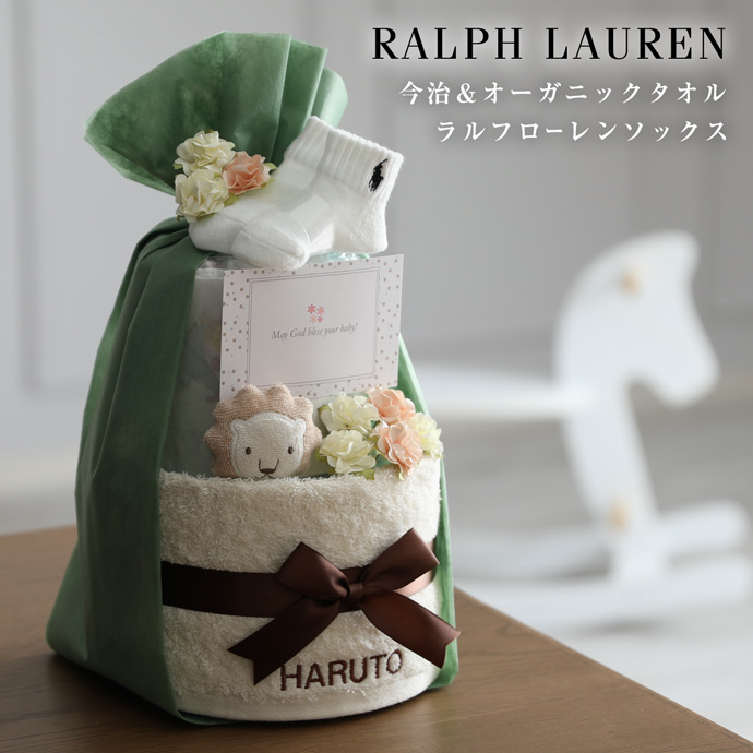 おむつケーキ ラルフローレン ベビーソックス 出産祝い 2段 名入れ 男の子 女の子 POLO RALPH LAUREN くすみカラー 今治タオル オーガニック 大人気