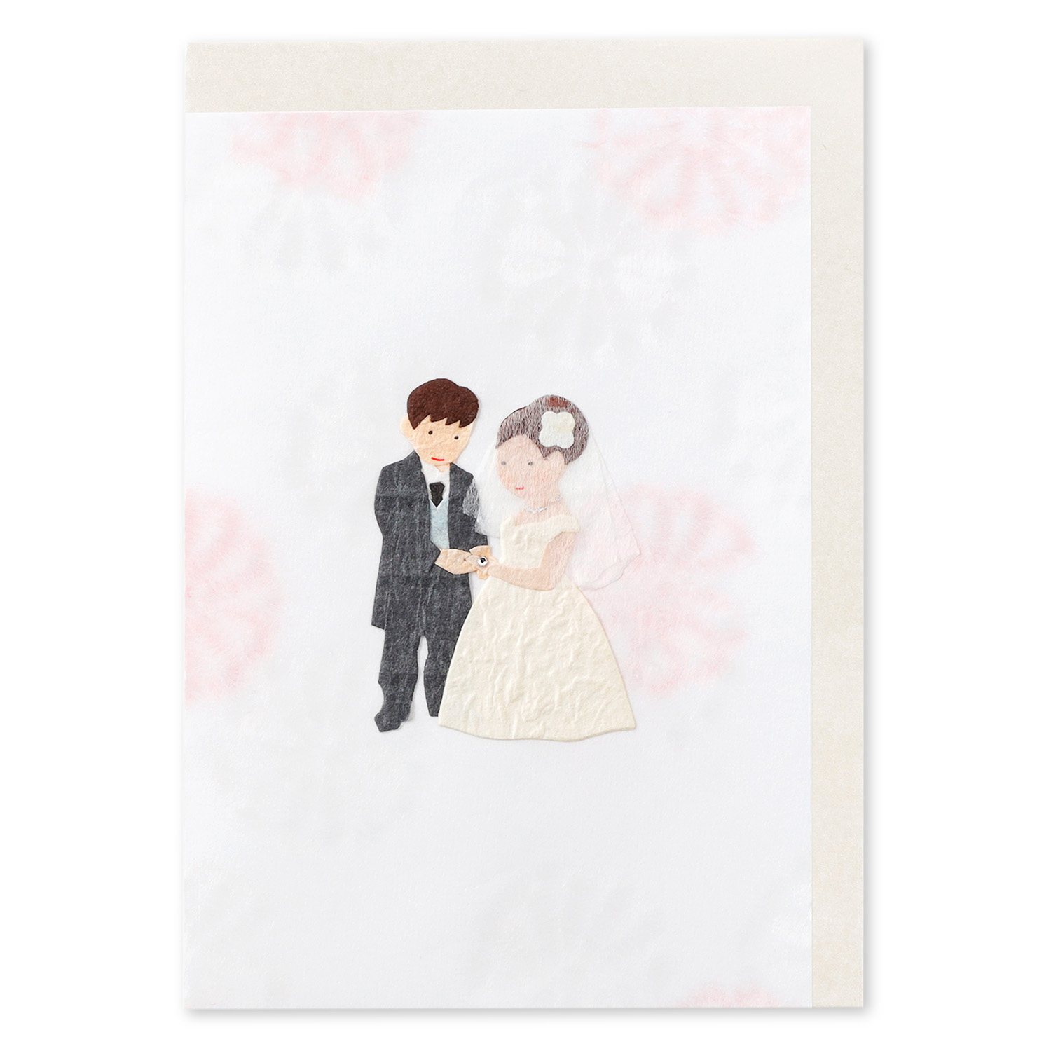 白とピンクの花模様の入った和紙にウェディング姿の新婦の切り絵をあしらった、 華やかな和紙のクラフトカードです。