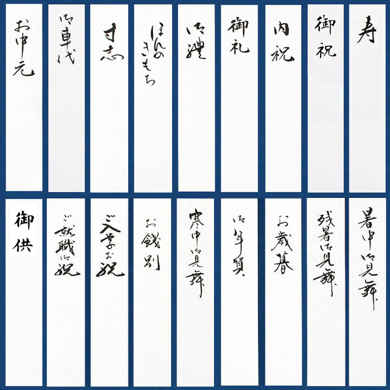 寿・御祝・内祝・御礼・御禮(おれい)・ほんのきもち・寸志・お車代・お中元・暑中御見舞・残暑御見舞・お歳暮・御年賀・寒中御見舞・お餞別・ご入学お祝・ご就職御祝・御供