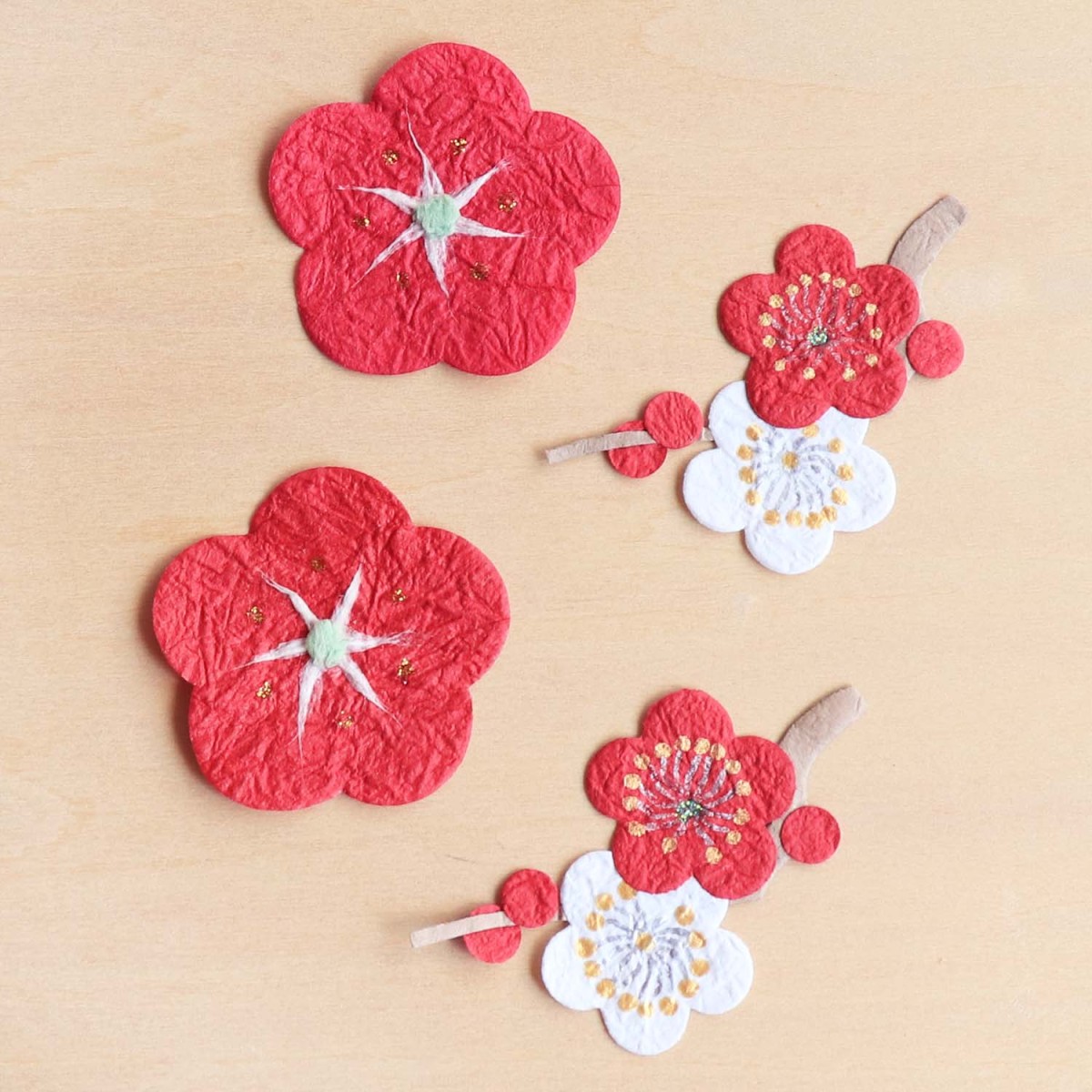 紅白の梅がほころぶ枝と一輪の梅の花の和紙パーツです。