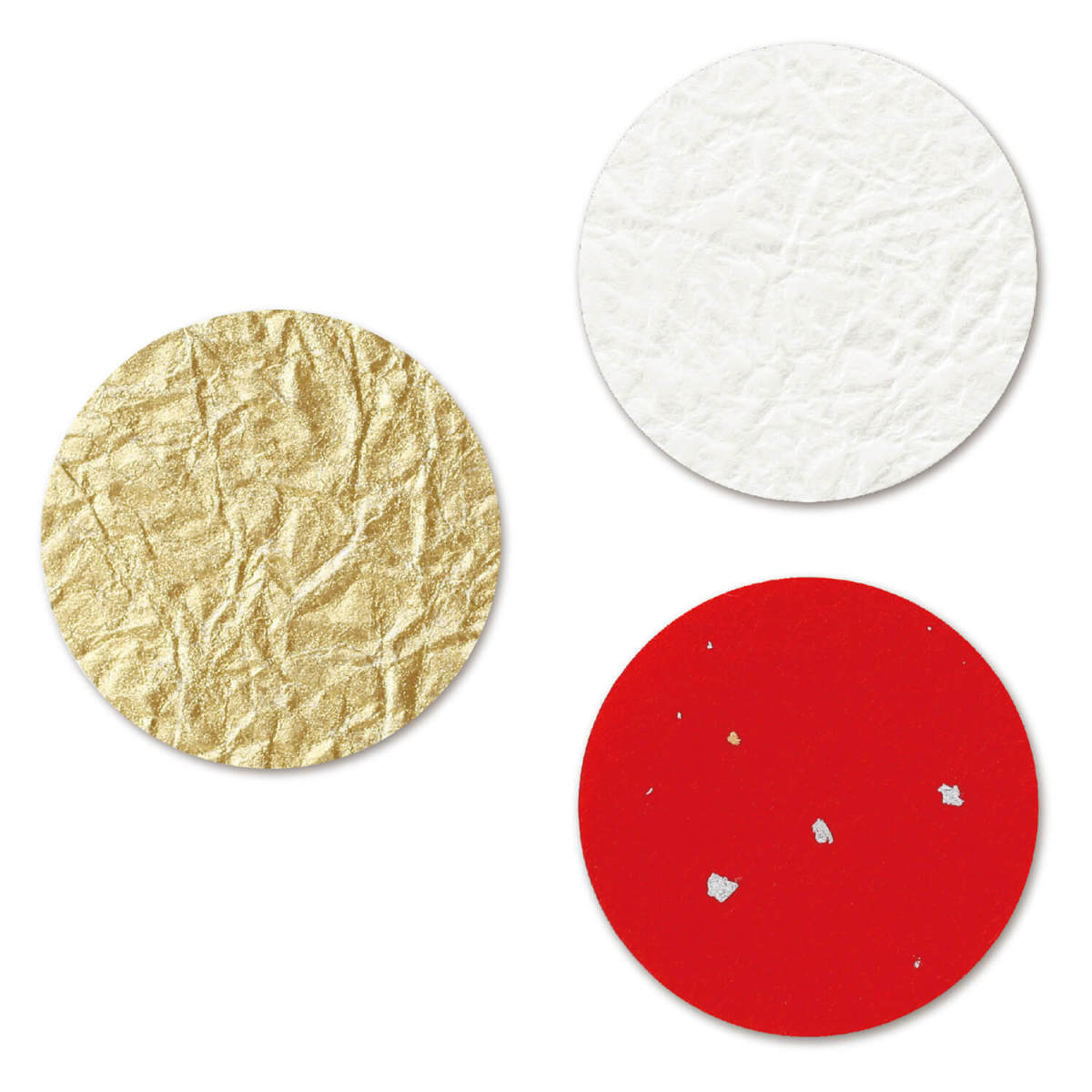 金銀砂子入りの赤い和紙、白と金の揉み紙。3種類の和紙を丸形に抜いた和紙パーツセットです。