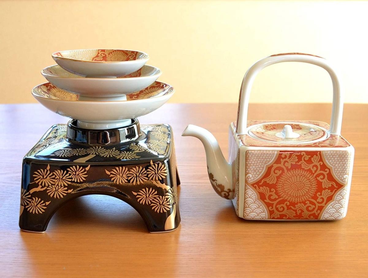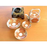 有田焼 屠蘇器 おとその器 赤地金彩菊華紋 お屠蘇揃い (黒い台も磁器製)