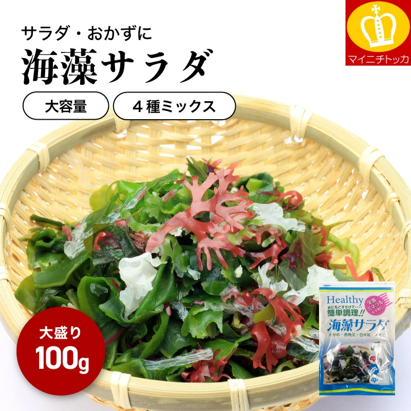 乾燥カット海藻ミックス、大容量のどっさり100g♪袋からひとつまみ取り出して、水で戻すかそのままお味噌汁や麺類やスープに入れるだけ!美味しい海藻サラダや海藻スープが出来上がります♪しかも低価格なので、たっぷり贅沢に使えます♪