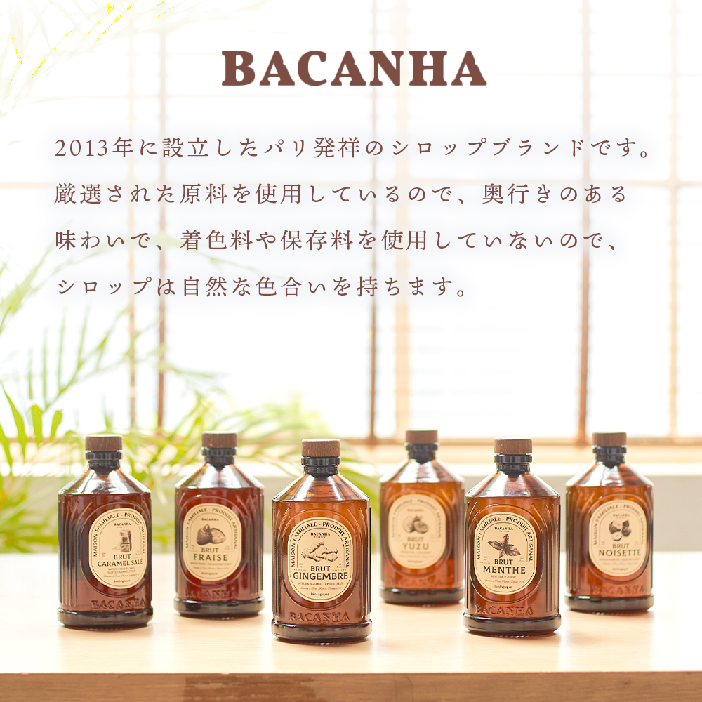 | 商品名 | BACANHA シロップ(ジンジャー/ミント/ゆず/いちご/塩キャラメル/ヘーゼルナッツ) |