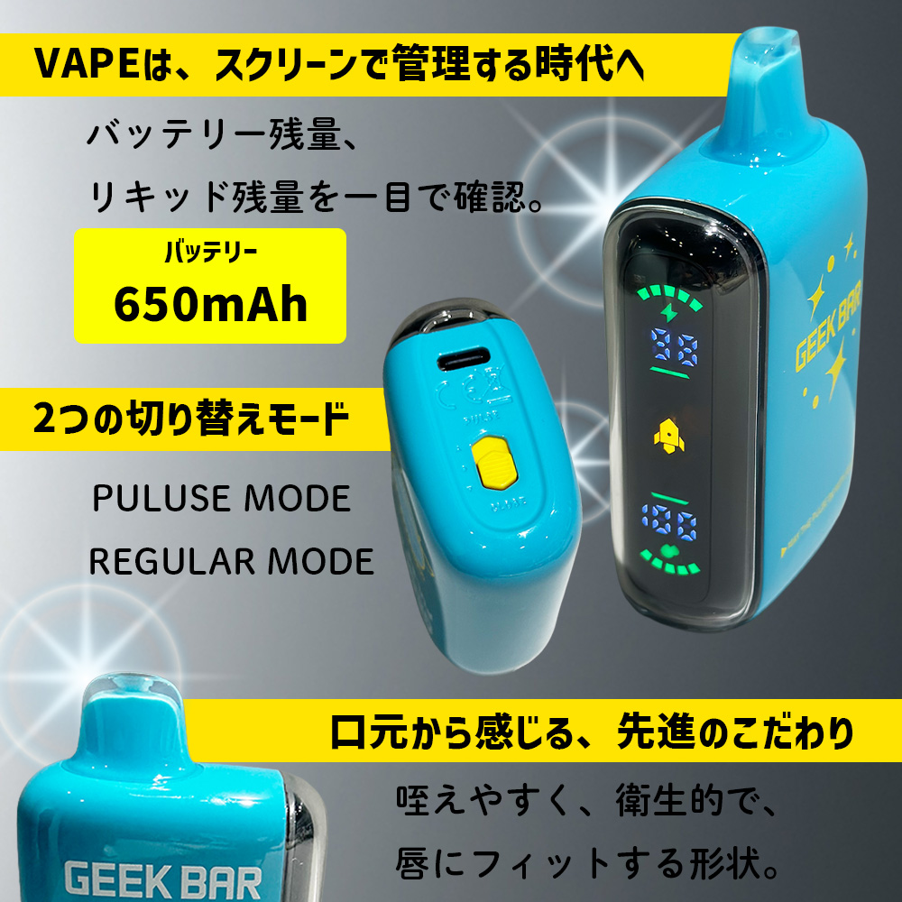 | 説明 | 覚醒せよ、爆煙の宇宙へ。フルスクリーン搭載 × ニコチン0の次世代VAPE。 バッテリー残量・リキッド残量を一目で確認できるスマートディスプレイを搭載。 これ1台で、紙タバコ約75箱分相当(※紙タバコ1箱200回吸引の場合の試算)。圧倒的なコストパフォーマンスを実現しました。 |