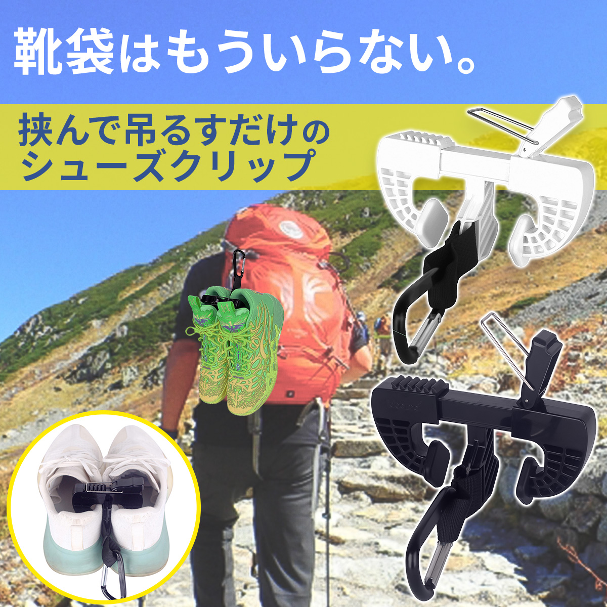 シューズクリップ ホルダー カラナビ付 靴 挟む 携帯 アウトドア スポーツ リュック取り付け 便利グッズ 軽量 ABS 男女兼用