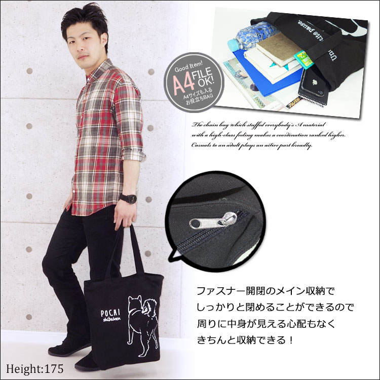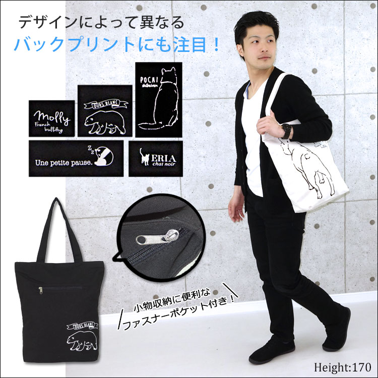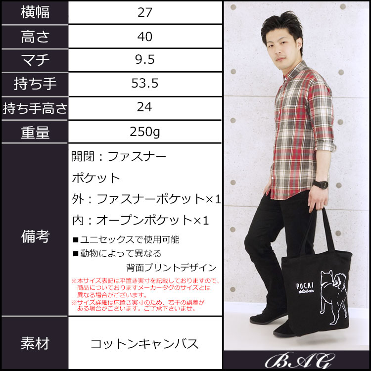 | Point | ・動物の後ろ姿がプリントされたキュートな縦長トート★ ・開閉口にはファスナー付きで機能面もバツグン! ・友達や親子同士のお揃い持ちもオススメ♪ ・動物によって背面デザインが異なるのも魅力のひとつ◎ ・個性溢れる可愛いトートバッグでお出かけを楽しもう☆彡 |