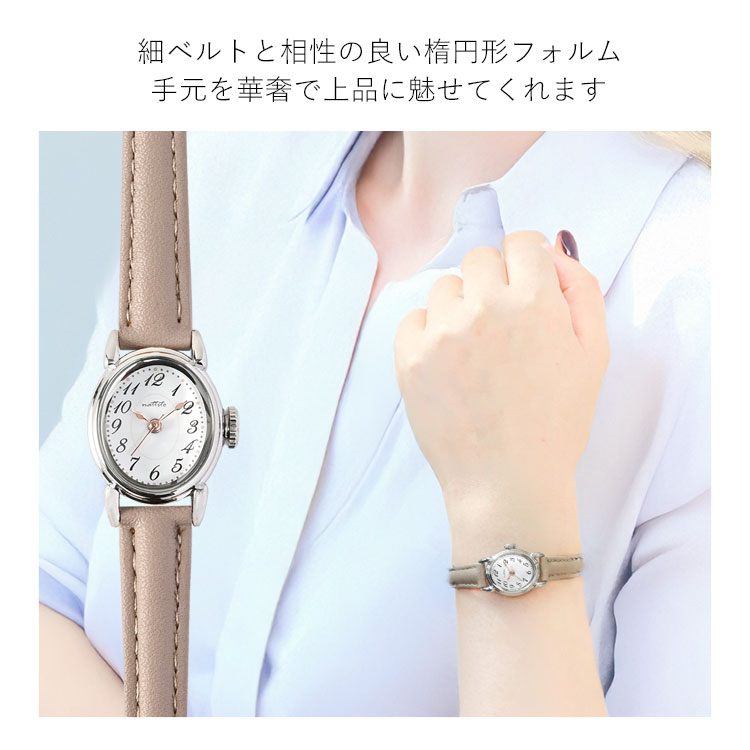 | Point | ・小ぶりで手元に馴染むオーバルフェイスの腕時計です ・アンティーク調でアクセサリーのように手元を彩ります ・軽やかな着け心地で長時間着用もストレスなく快適〇 ・オン・オフ問わず使えるので幅広いシーンにマッチ! ・上品で高級感あるデザインだから贈り物にも喜ばれます |