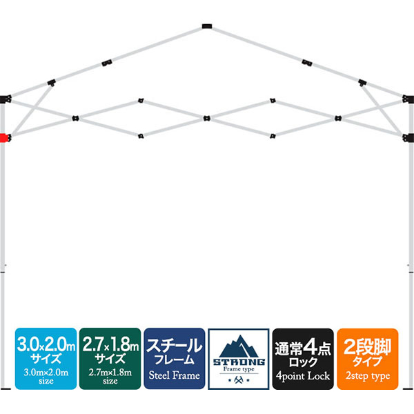 3.0×2.0m、2.7×1.8mサイズ スチールフレーム(強化版) 4点ロック 2段脚