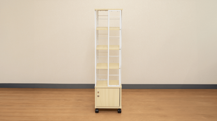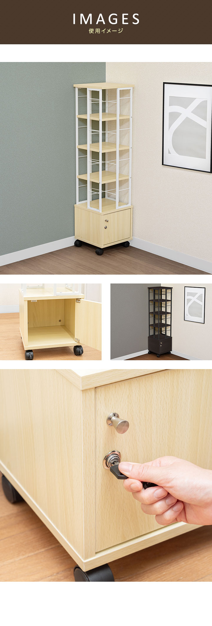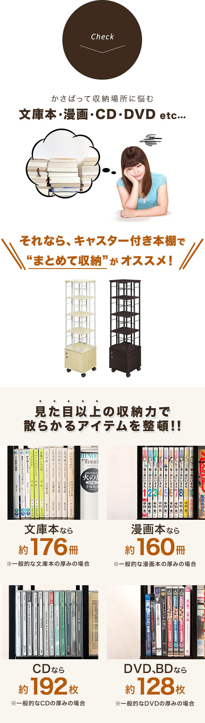 キャスター付きなので移動させたい時に便利。本体も360°回転させることができるので、奥面の棚でもお目当ての本やCDが探しやすいです。