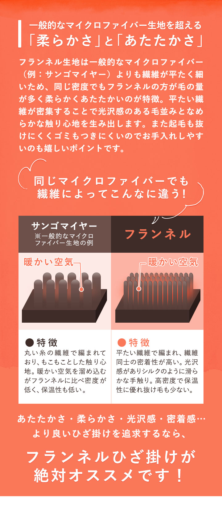 あたたかくてやわらかく、滑らかなフランネルを使用。シルクのような高級感のある光沢とマシュマロのようなやわらかな肌触りで、肌寒い季節から冬本番まで快適に使用できます。