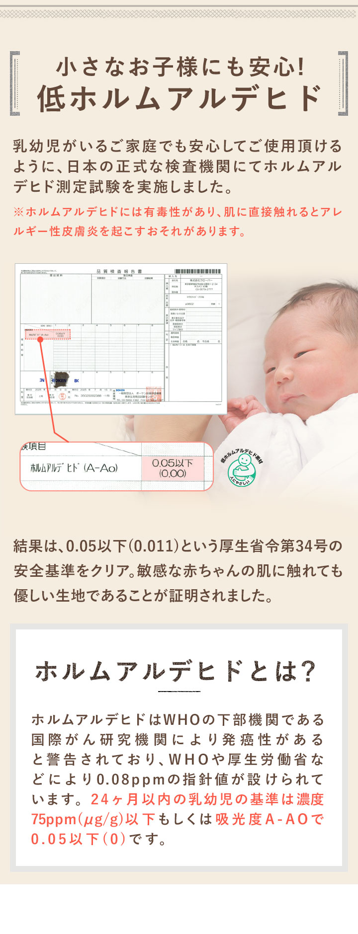乳幼児がいるご家庭でも安心してご使用頂けるように、日本の正式な検査機関にてホルムアルデヒド測定試験を実施しました。