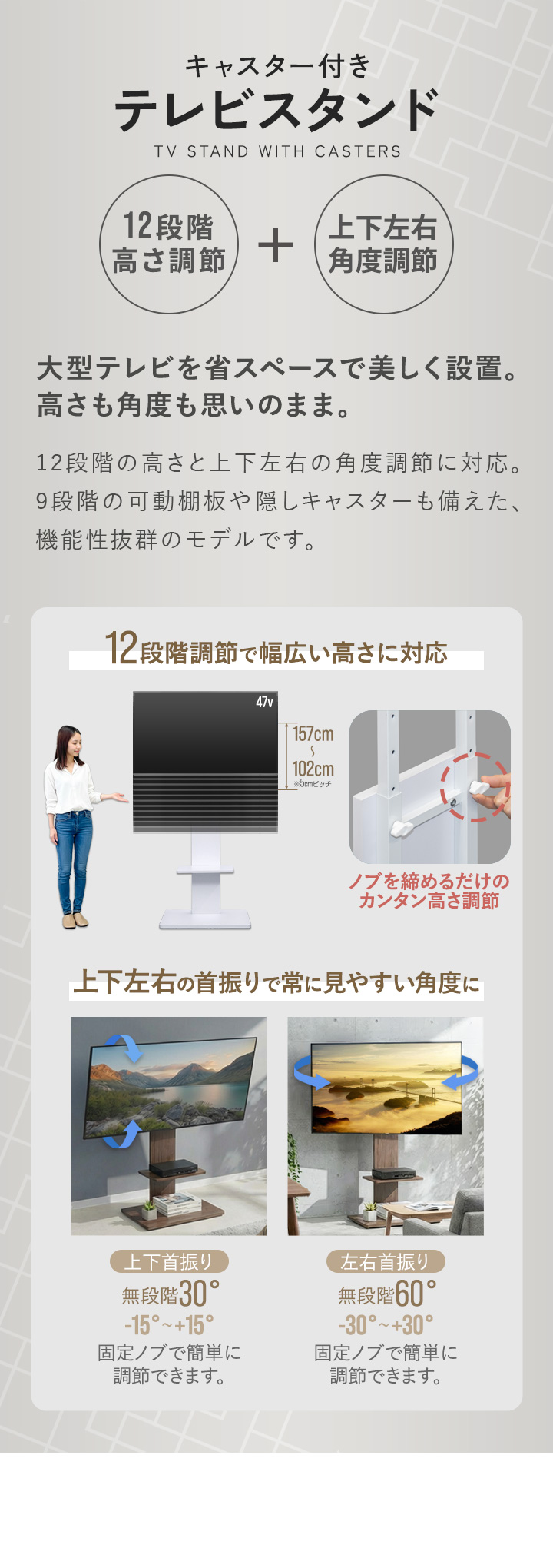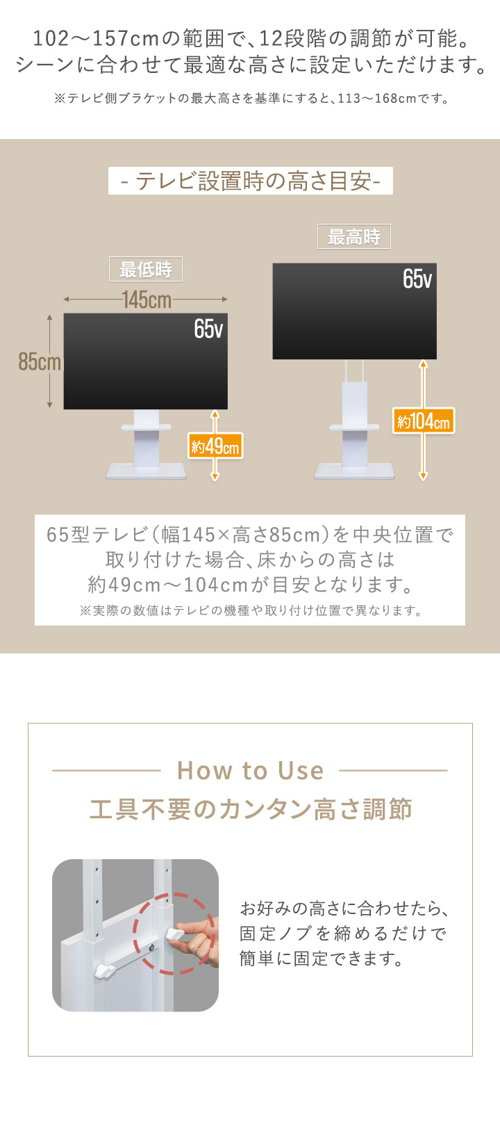 | 高さ調節(ブラケット取付位置): 12段階 (約)102cm/107cm/112cm/117cm/122cm/127cm/132cm/137cm/142cm/147cm/152cm/157cm |