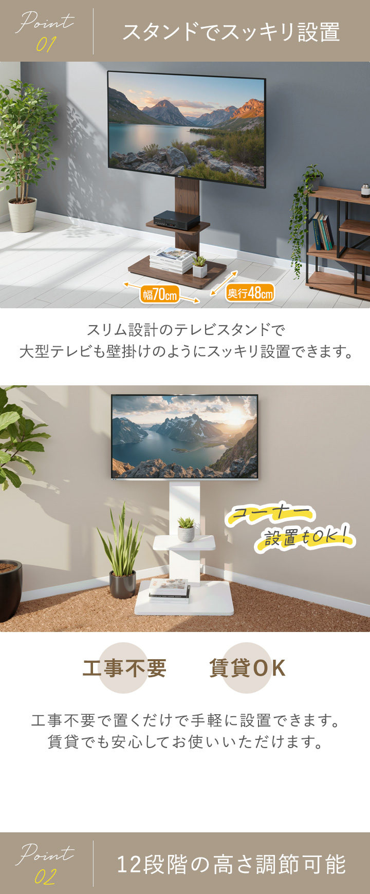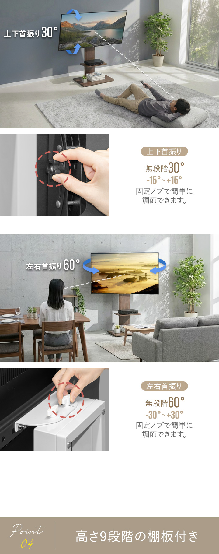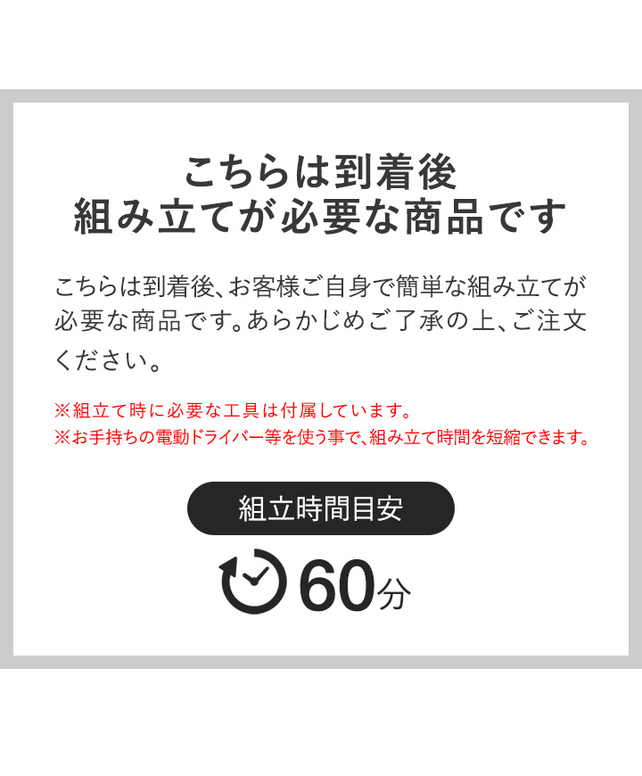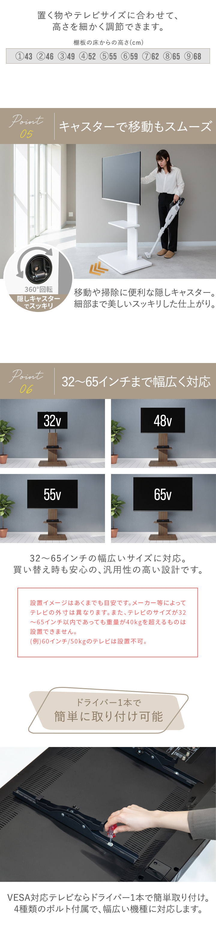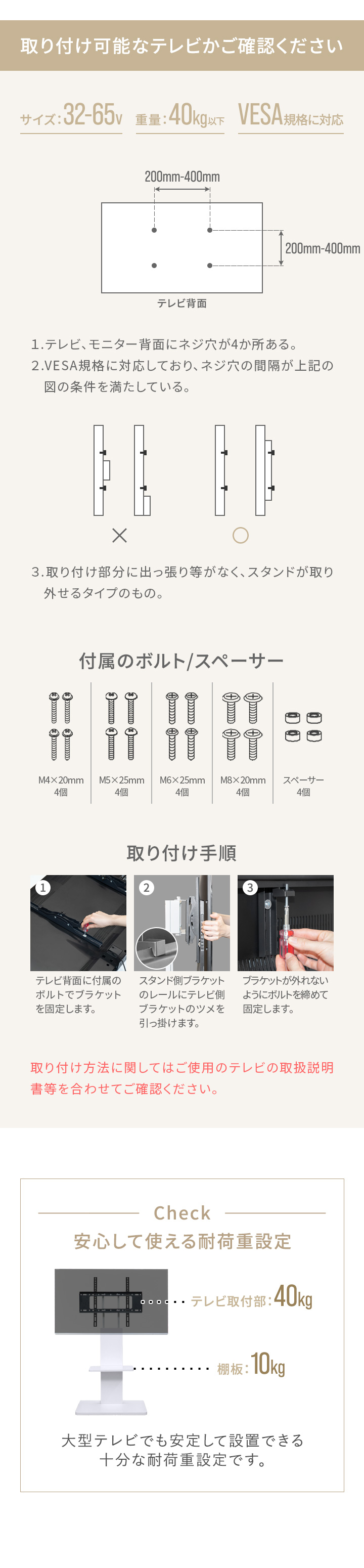 | 特記事項: ※こちらの商品はお客様組み立て品となります。(工具は付属しております) ※テレビ取付用ネジ、スペーサーは付属しています。 ・M4×20mm、M5×25mm、M6×25mm、M8×20mm、スペーサー 各4個ずつ ※取り付けるテレビのボルト穴のサイズに応じて適切なボルトを選び、スペーサーを使用して調節してください。 取り付け方法に関してはご使用のテレビの取扱説明書等を併せてご確認ください。 ※テレビのサイズが32〜65インチ以内であっても、重量が40kgを超えるものは設置できません。(例 サイズ60インチ/重量50kgのテレビは設置不可) |
