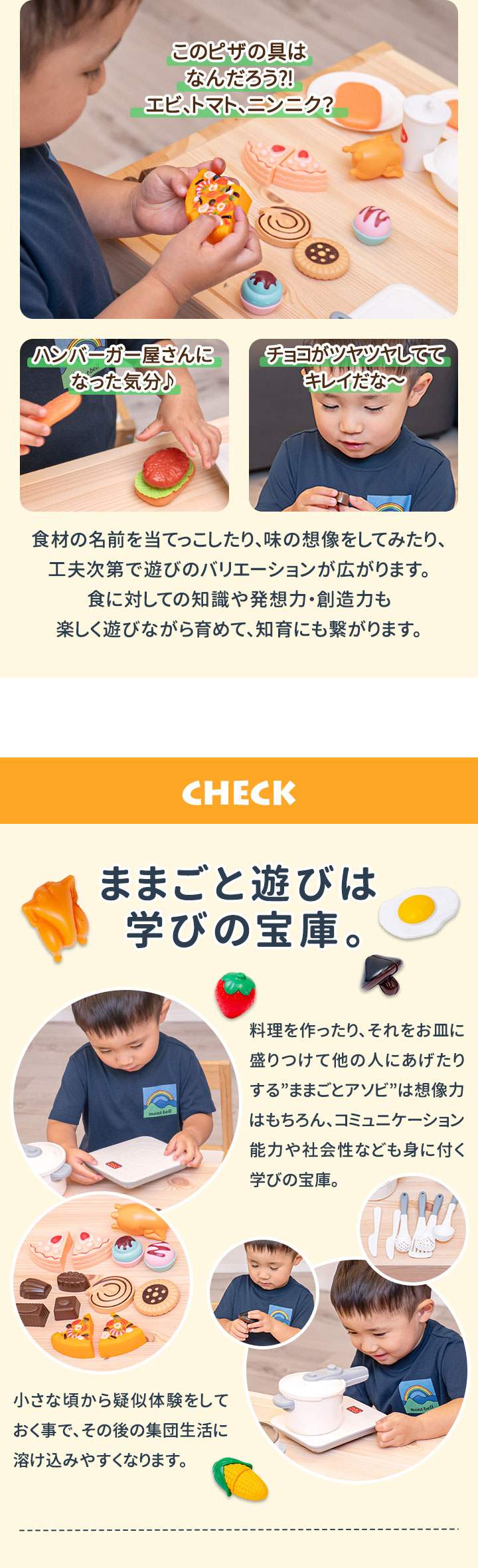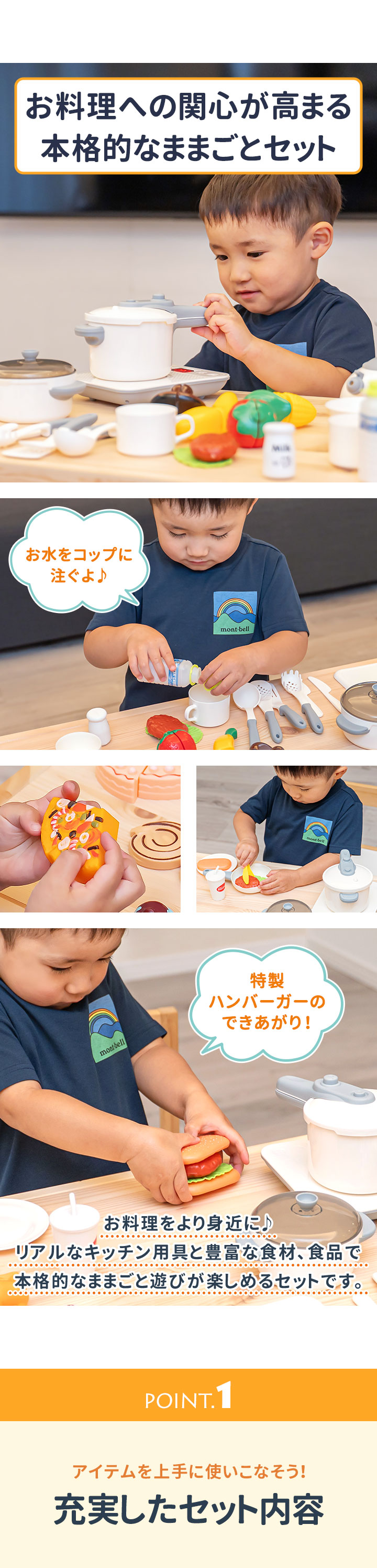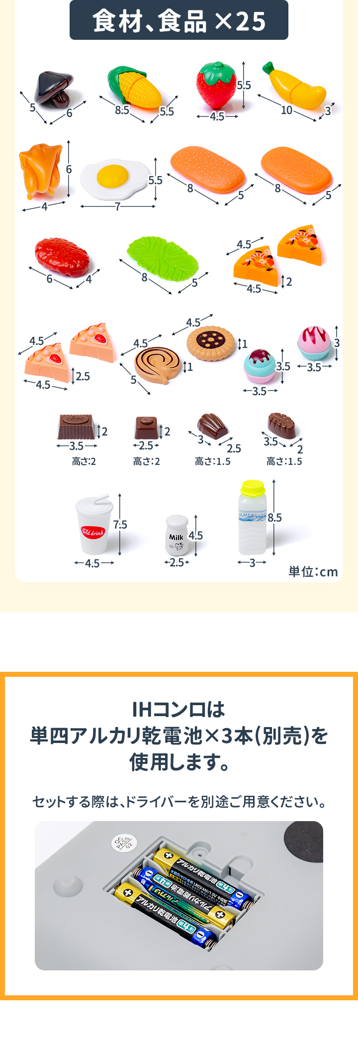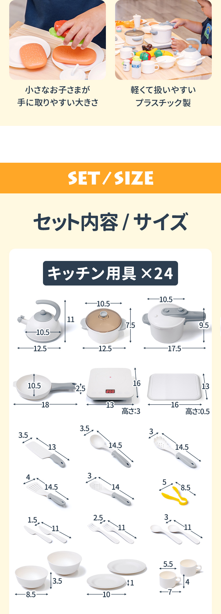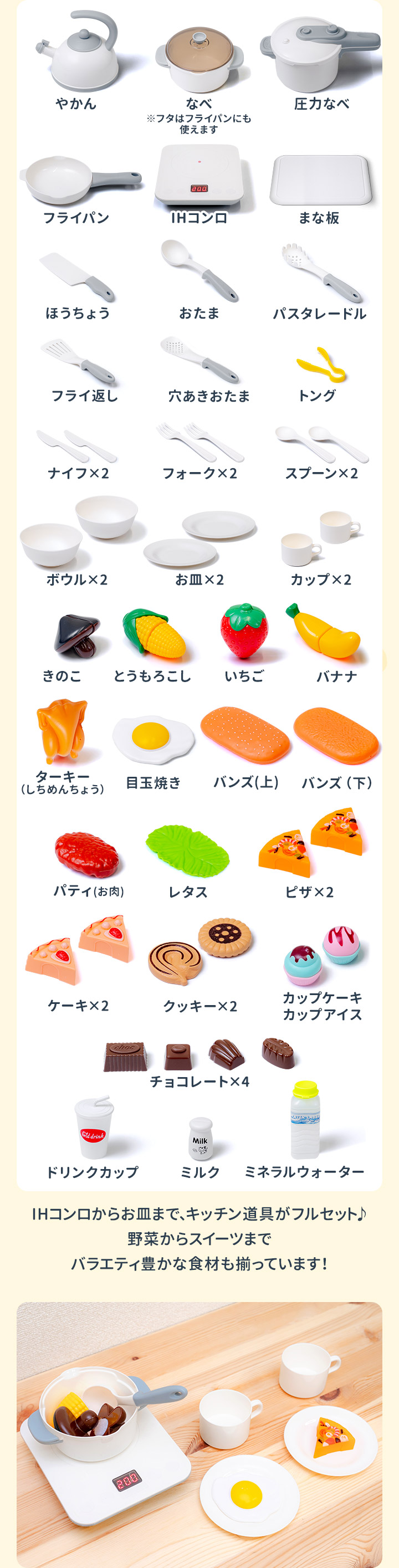 | セット内容: 【キッチン用具】 やかん/なべ/圧力なべ/フライパン/IHコンロ/まな板/ほうちょう/おたま/パスタレードル/フライ返し/穴あきスプーン/トング/ナイフ×2/フォーク×2/スプーン×2/ボウル×2/お皿×2/カップ×2 【食材、食品】 きのこ/とうもろこし/いちご/バナナ/ターキー/目玉焼き/バンズ(上)/バンズ(下)/パティ/レタス/ピザ×2/ケーキ×2/クッキー×2/カップケーキ/カップアイス/チョコレート×4/ドリンクカップ/ミルク/ミネラルウォーター |