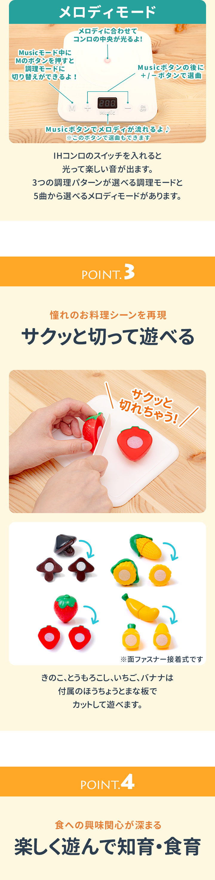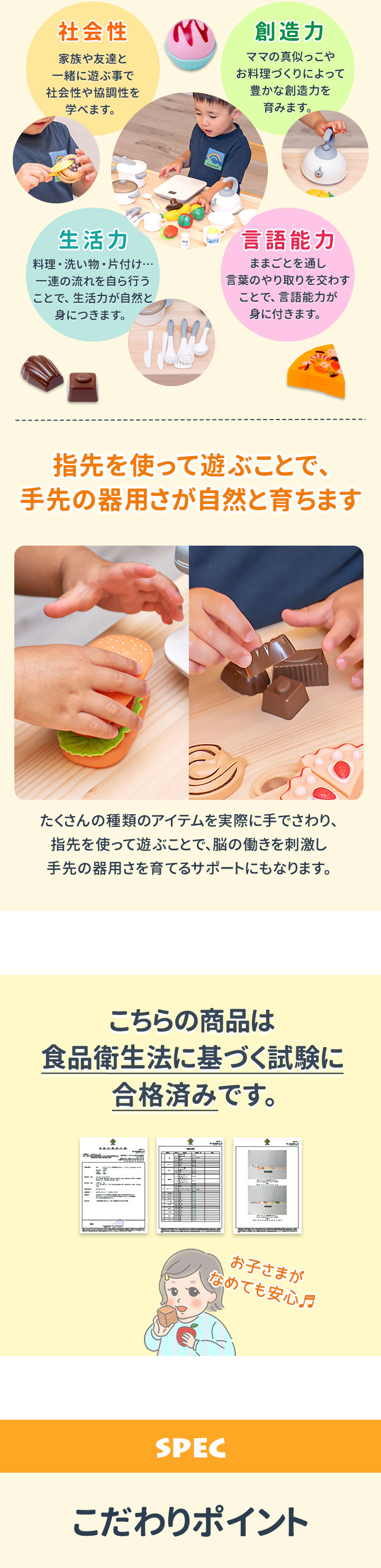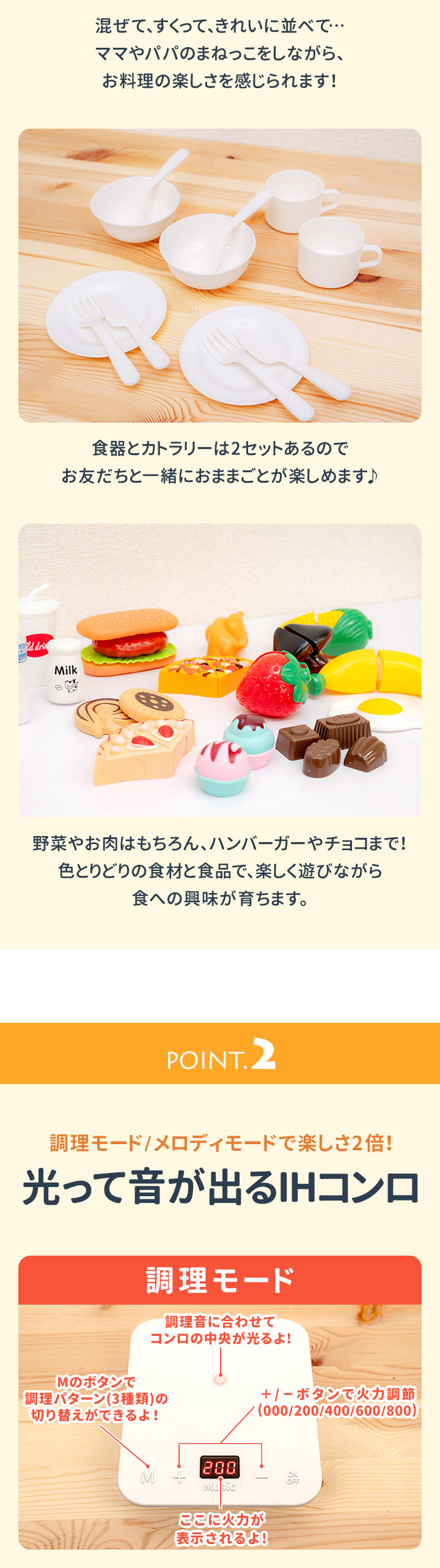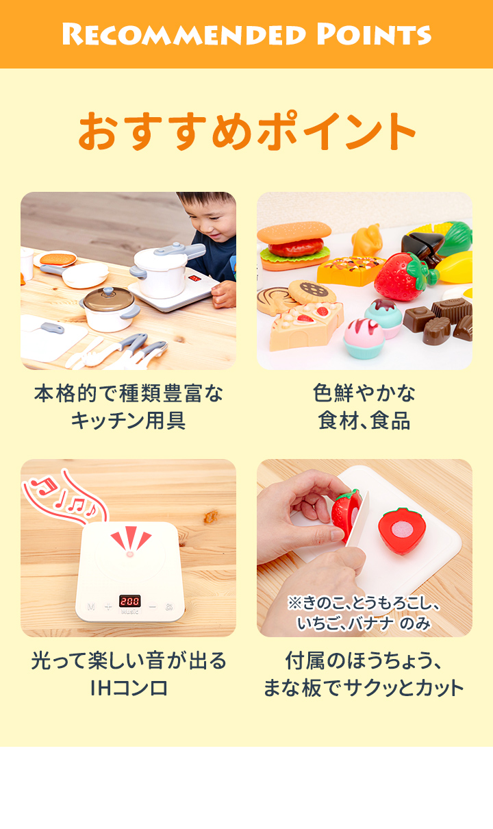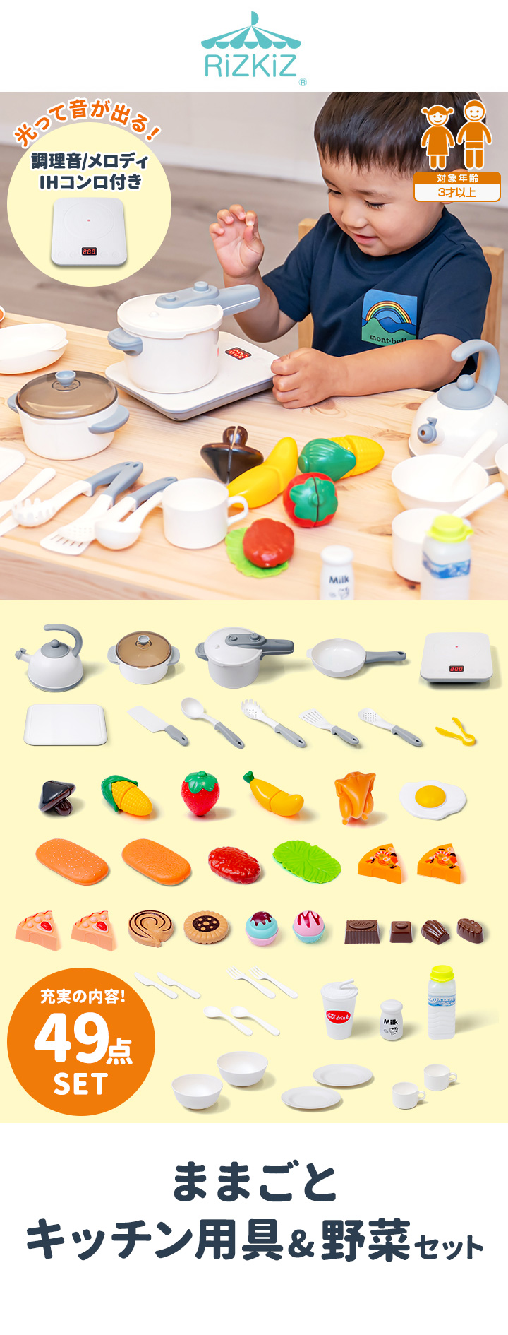 | セット内容: 【キッチン用具】 やかん/なべ/圧力なべ/フライパン/IHコンロ/まな板/ほうちょう/おたま/パスタレードル/フライ返し/穴あきスプーン/トング/ナイフ×2/フォーク×2/スプーン×2/ボウル×2/お皿×2/カップ×2 【食材、食品】 きのこ/とうもろこし/いちご/バナナ/ターキー/目玉焼き/バンズ(上)/バンズ(下)/パティ/レタス/ピザ×2/ケーキ×2/クッキー×2/カップケーキ/カップアイス/チョコレート×4/ドリンクカップ/ミルク/ミネラルウォーター |