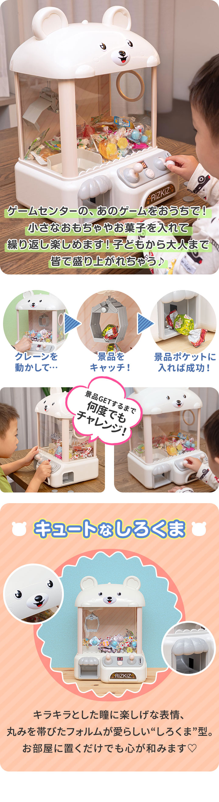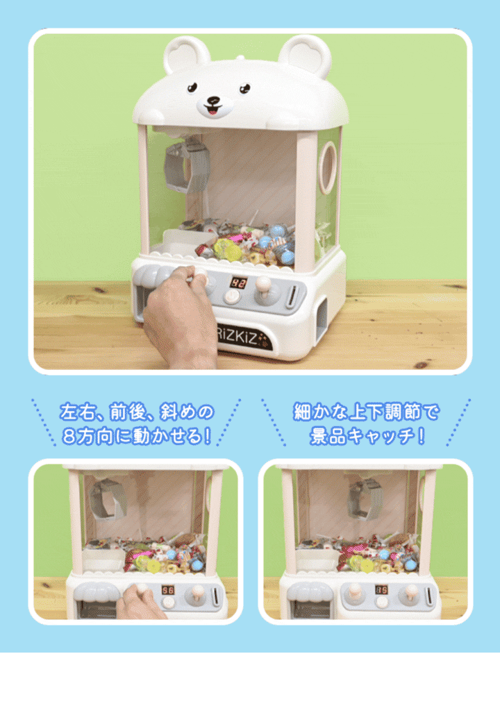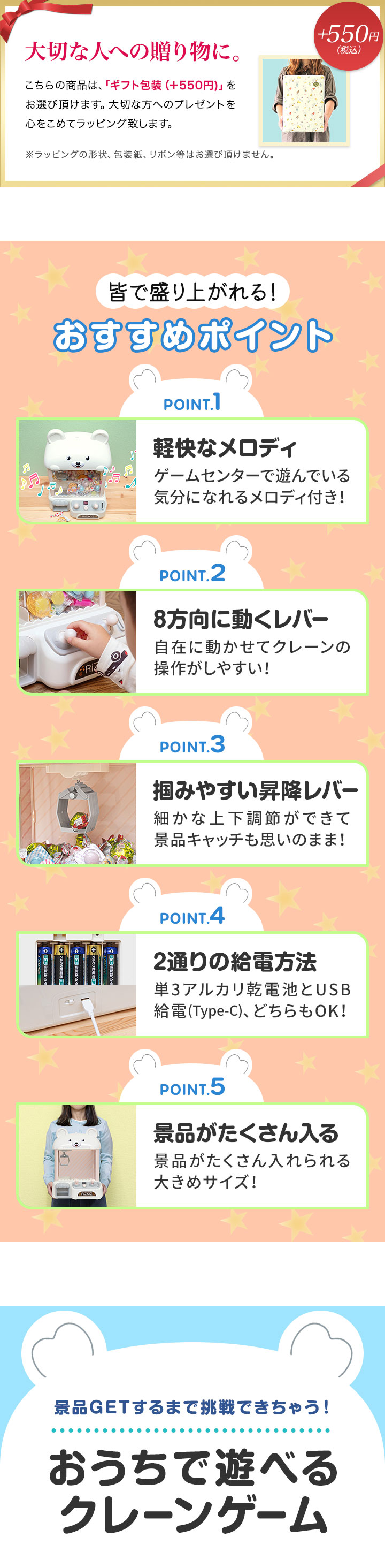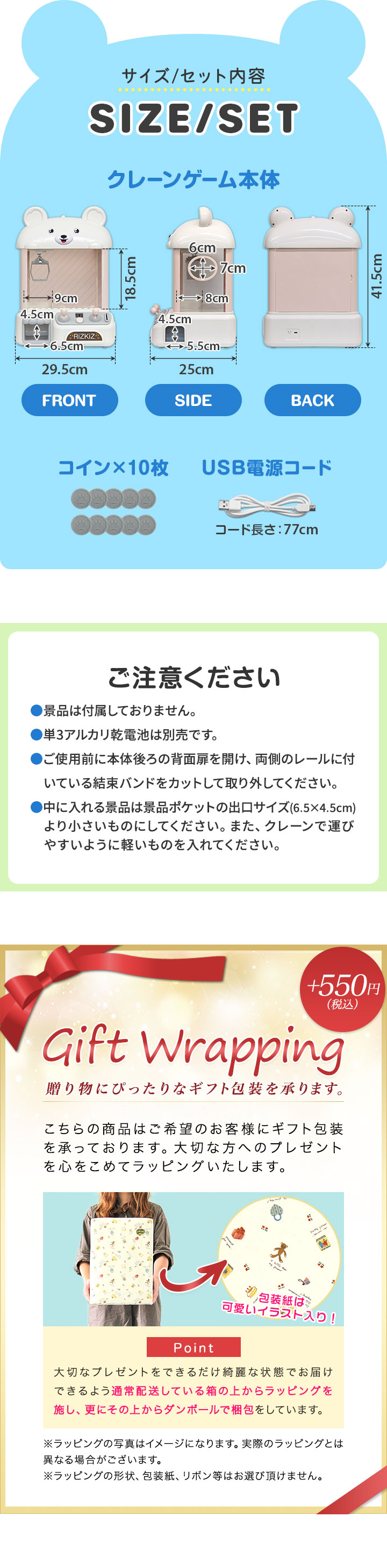 | 特記事項: ・景品は付属しておりません。 ・単3アルカリ乾電池は別売です。 ・USB給電は電源供給用であり、充電機能(内蔵バッテリー)はございません。コードレスでの使用はできませんのでご了承ください。 ・ご使用前に本体後ろの背面扉を開け、両側のレールに付いている結束バンドをカットして取り外してください。 ・中に入れる景品は景品ポケット出口のサイズ(6.5×4.5cm)より小さいものにしてください。また、クレーンで運びやすいように 軽いものを入れてください。 |