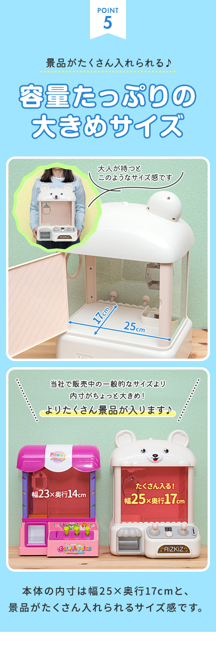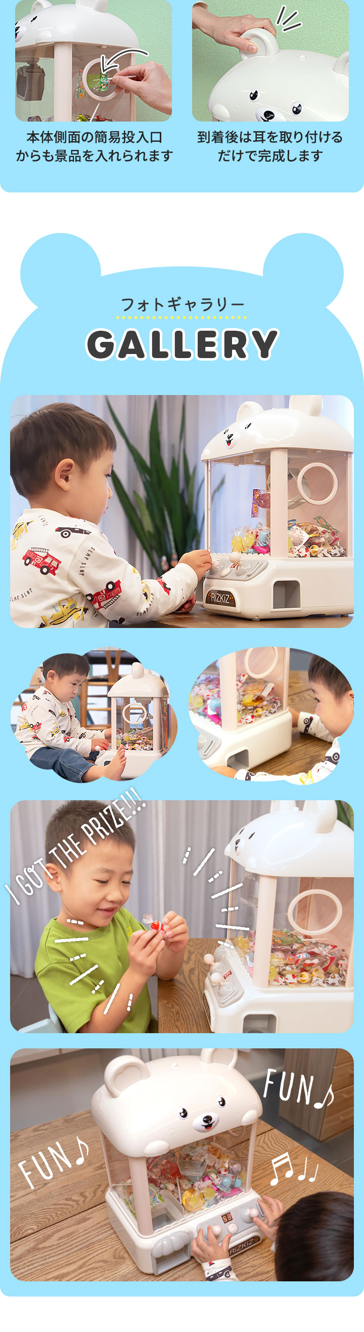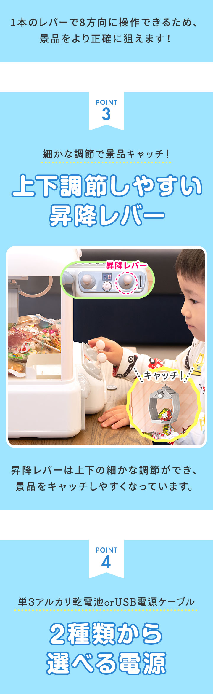 | 特記事項: ・景品は付属しておりません。 ・単3アルカリ乾電池は別売です。 ・USB給電は電源供給用であり、充電機能(内蔵バッテリー)はございません。コードレスでの使用はできませんのでご了承ください。 ・ご使用前に本体後ろの背面扉を開け、両側のレールに付いている結束バンドをカットして取り外してください。 ・中に入れる景品は景品ポケット出口のサイズ(6.5×4.5cm)より小さいものにしてください。また、クレーンで運びやすいように 軽いものを入れてください。 |
