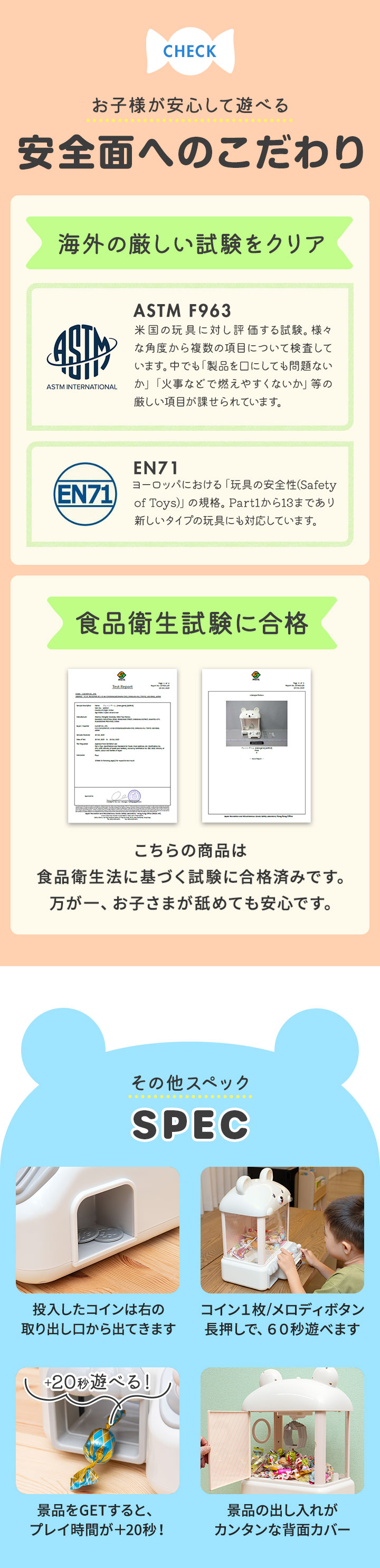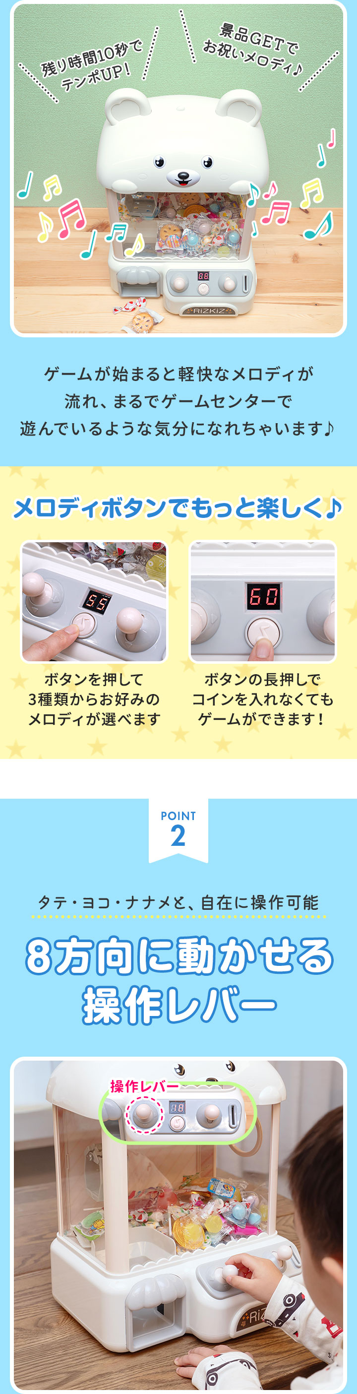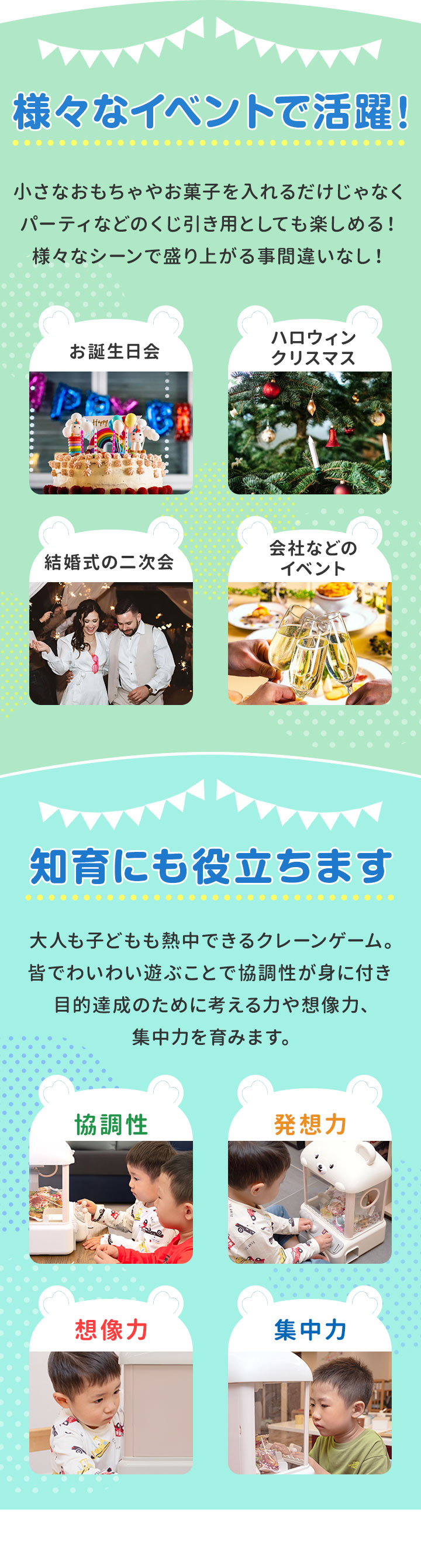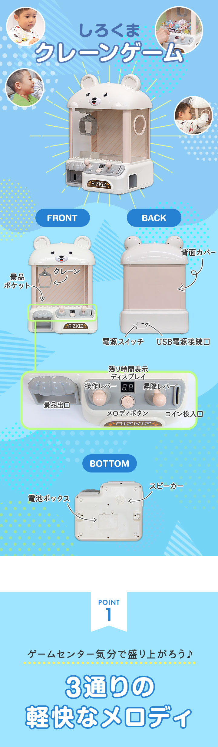 | 特記事項: ・景品は付属しておりません。 ・単3アルカリ乾電池は別売です。 ・USB給電は電源供給用であり、充電機能(内蔵バッテリー)はございません。コードレスでの使用はできませんのでご了承ください。 ・ご使用前に本体後ろの背面扉を開け、両側のレールに付いている結束バンドをカットして取り外してください。 ・中に入れる景品は景品ポケット出口のサイズ(6.5×4.5cm)より小さいものにしてください。また、クレーンで運びやすいように 軽いものを入れてください。 |