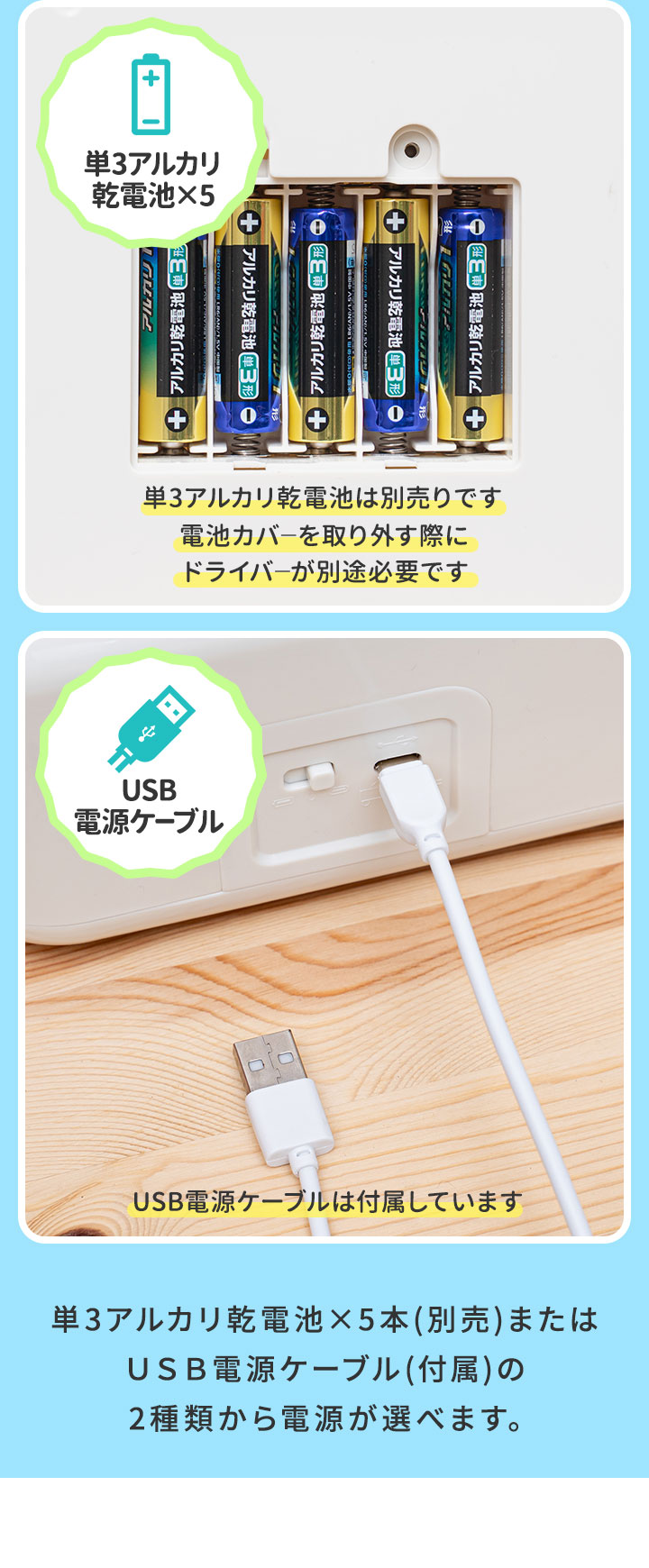 | 給電方式: 単三アルカリ乾電池×5本(別売) / USB給電(USB電源コード付属) ※電池カバーを開ける為のドライバーを別途ご用意ください。 |
