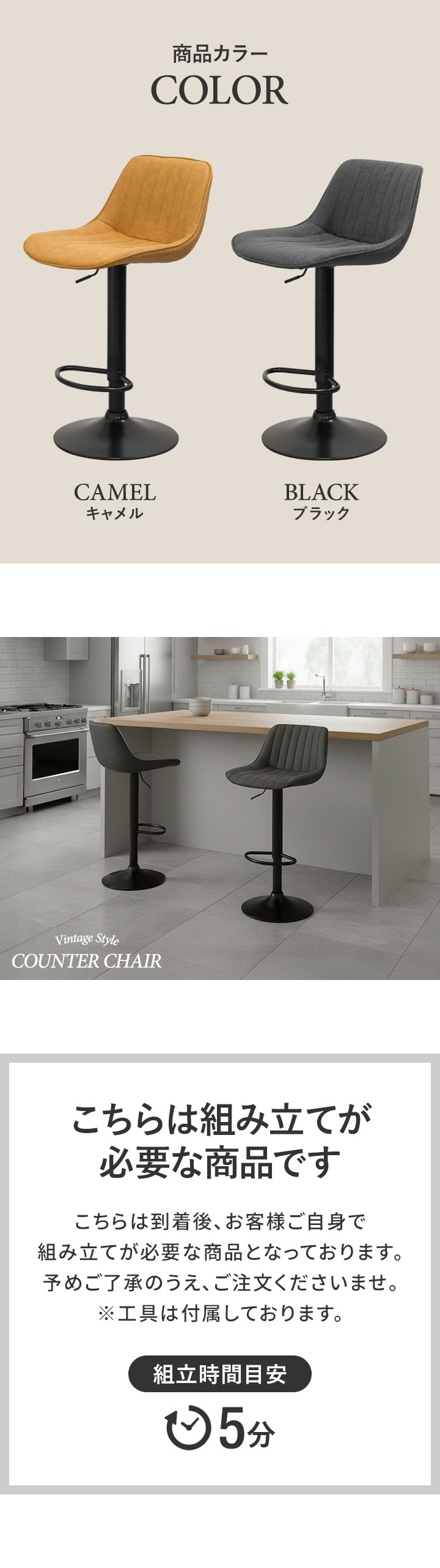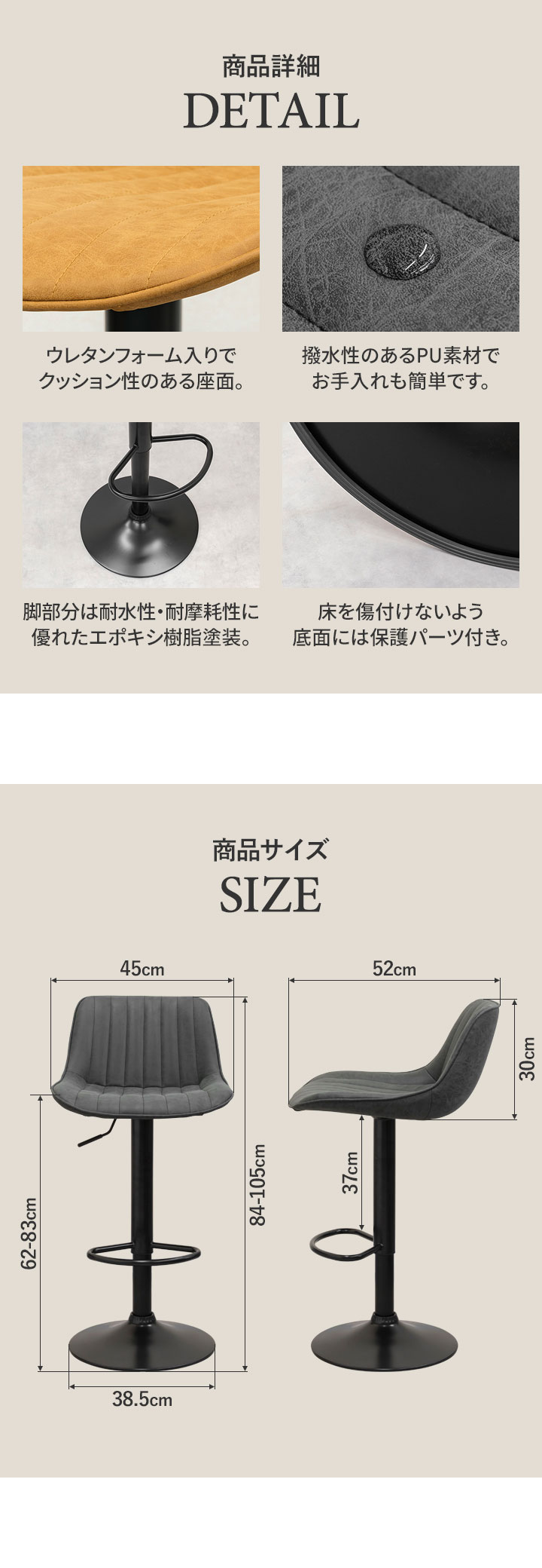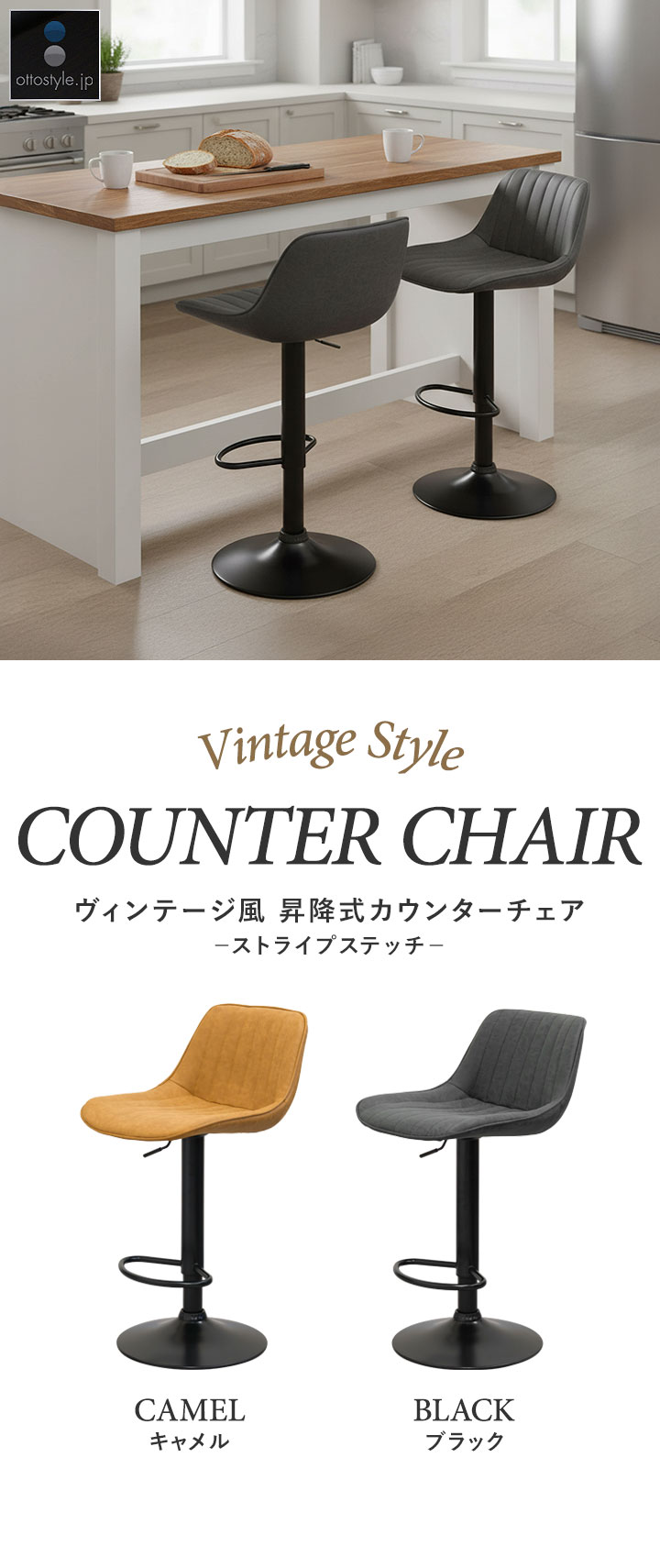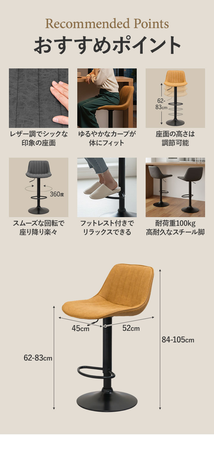 1年保証 カウンターチェア 1脚 単品 背もたれ付き 360°回転 ガス圧昇降 高さ調整 座面高62〜83cm ストライプステッチ おしゃれ バーチェア 送料無料